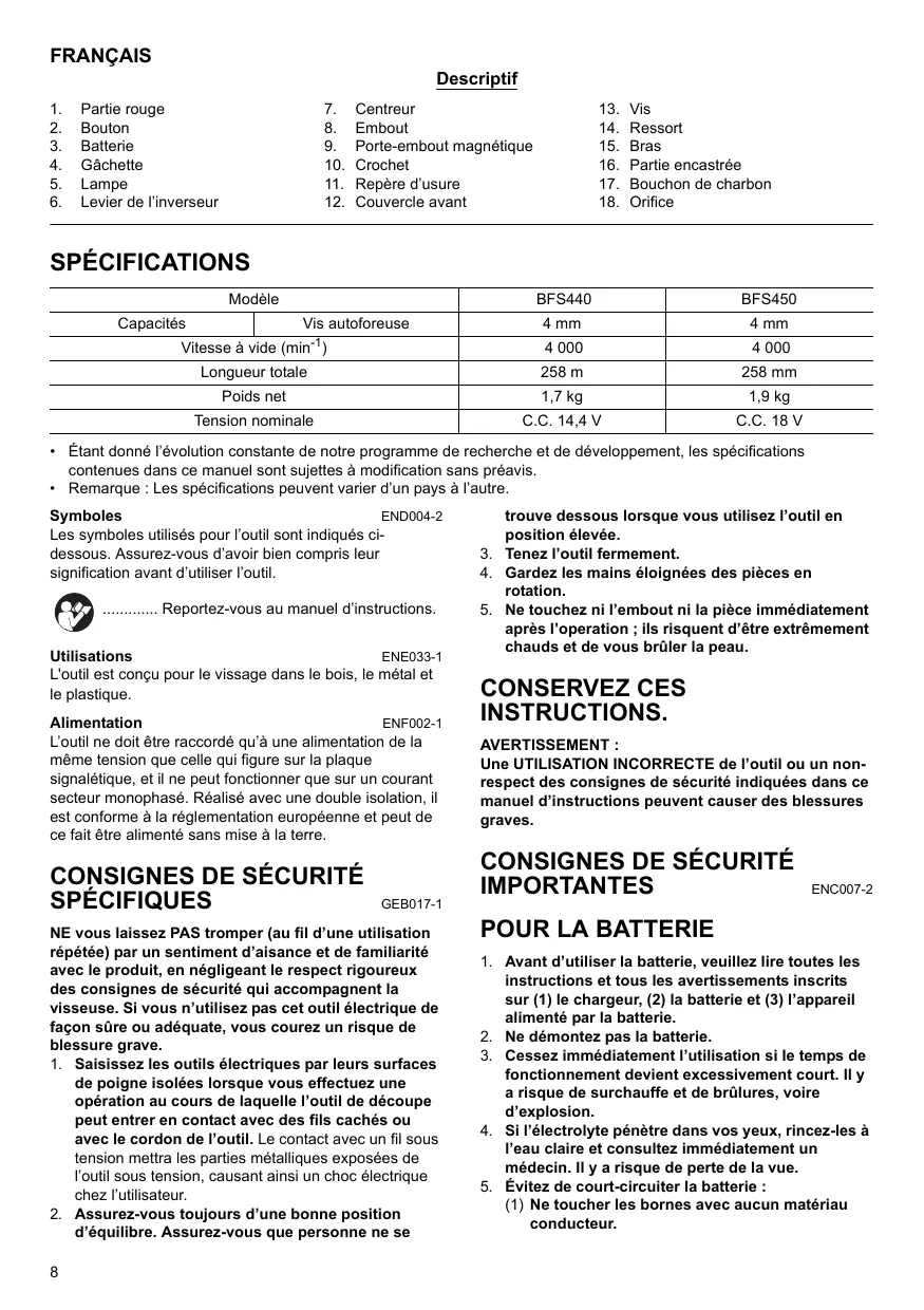 8JD, ENGLAND FRANÇAIS Descriptif 1. Partie rouge 7. Centreur 13. Vis 2. Bouton 8. Embout 14. Ressort 3. Batterie 9. Porte-embout magnétique 15. Bras 4. Gâchette 10. Crochet 16. Partie encastrée 5. Lampe 11. Repère d'usure 17. Bouchon de charbon 6. Levier de l'inverseur 12. Couvercle avant 18. Orifice SPÉCIFICATIONS Modèle BFS440 BFS450 Capacités I Vis autoforeuse 4 mm 4 mm Vitesse à vide (min°) 4 000 4 000 Longueur totale 258 m 258 mm Poids net 1,7kg 19 kg Tension nominale C.C.144V C.C.18V