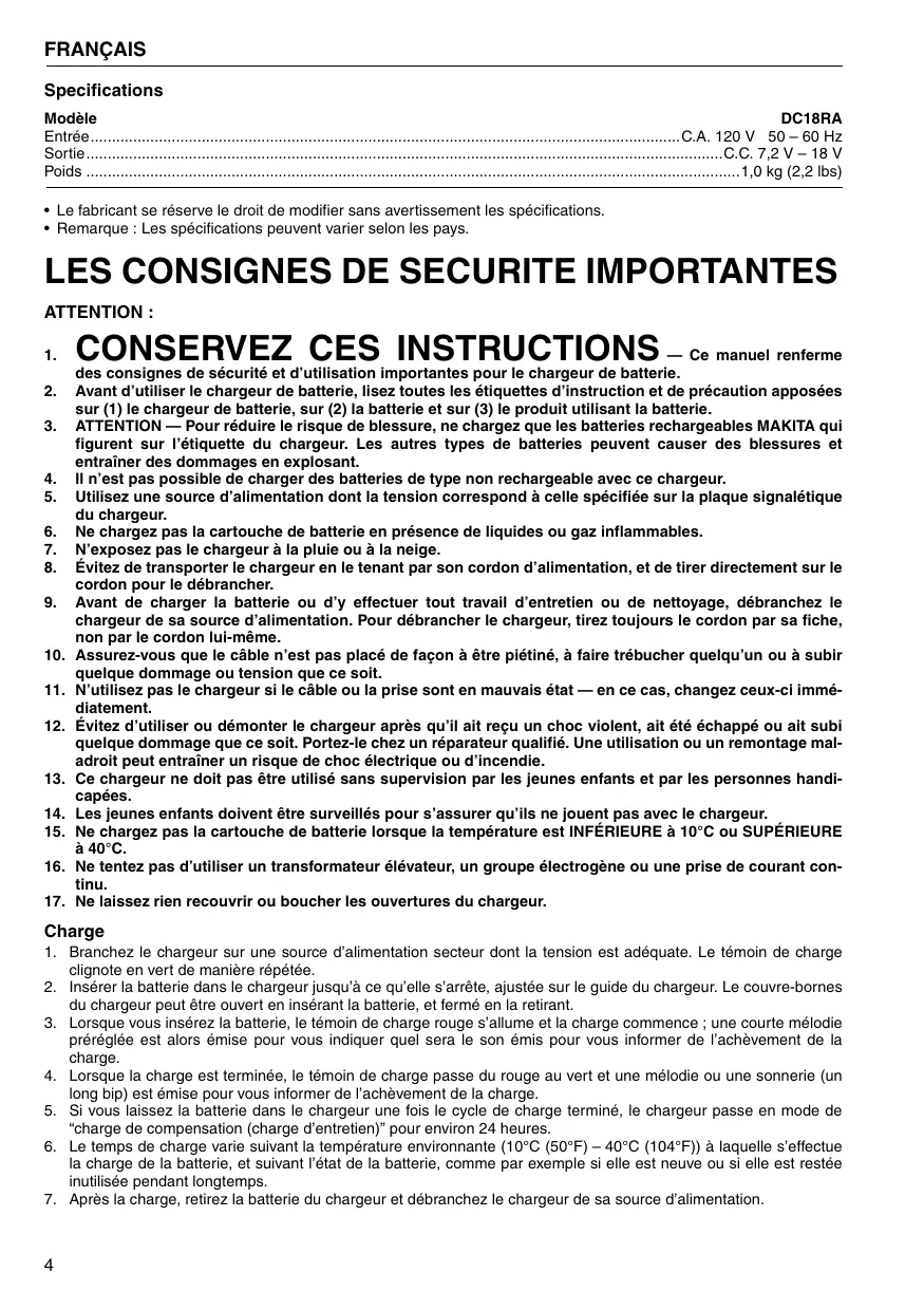 - Remarque : Les spécifications peuvent varier selon les pays. — Ce manuel renferme des consignes de sécurité et d’utilisation importantes pour le chargeur de batterie. Avant d’utiliser le chargeur de batterie, lisez toutes les étiquettes d’instruction et de précaution apposées sur (1) le chargeur de batterie, sur (2) la batterie et sur (3) le produit utilisant la batterie. ATTENTION — Pour réduire le risque de blessure, ne chargez que les batteries rechargeables MAKITA qui figurent sur l’étiquette du chargeur. Les autres types de batteries peuvent causer des blessures et entraîner des dommages en explosant. Il n’est pas possible de charger des batteries de type non rechargeable avec ce chargeur. Utilisez une source d’alimentation dont la tension correspond à celle spécifiée sur la plaque signalétique du chargeur. Ne chargez pas la cartouche de batterie en présence de liquides ou gaz inflammables. N’exposez pas le chargeur à la pluie ou à la neige. Évitez de transporter le chargeur en le tenant par son cordon d’alimentation, et de tirer directement sur le cordon pour le débrancher. Avant de charger la batterie ou d’y effectuer tout travail d’entretien ou de nettoyage, débranchez le chargeur de sa source d’alimentation. Pour débrancher le chargeur, tirez toujours le cordon par sa fiche, non par le cordon lui-même. Assurez-vous que le câble n’est pas placé de façon à être piétiné, à faire trébucher quelqu’un ou à subir quelque dommage ou tension que ce soit. N’utilisez pas le chargeur si le câble ou la prise sont en mauvais état — en ce cas, changez ceux-ci immédiatement. Évitez d’utiliser ou démonter le chargeur après qu’il ait reçu un choc violent, ait été échappé ou ait subi quelque dommage que ce soit. Portez-le chez un réparateur qualifié. Une utilisation ou un remontage maladroit peut entraîner un risque de choc électrique ou d’incendie. Ce chargeur ne doit pas être utilisé sans supervision par les jeunes enfants et par les personnes handicapées. Les jeunes enfants doivent être surveillés pour s’assurer qu’ils ne jouent pas avec le chargeur. Ne chargez pas la cartouche de batterie lorsque la température est INFÉRIEURE à 10°C ou SUPÉRIEURE à 40°C. Ne tentez pas d’utiliser un transformateur élévateur, un groupe électrogène ou une prise de courant continu. Ne laissez rien recouvrir ou boucher les ouvertures du chargeur. Charge