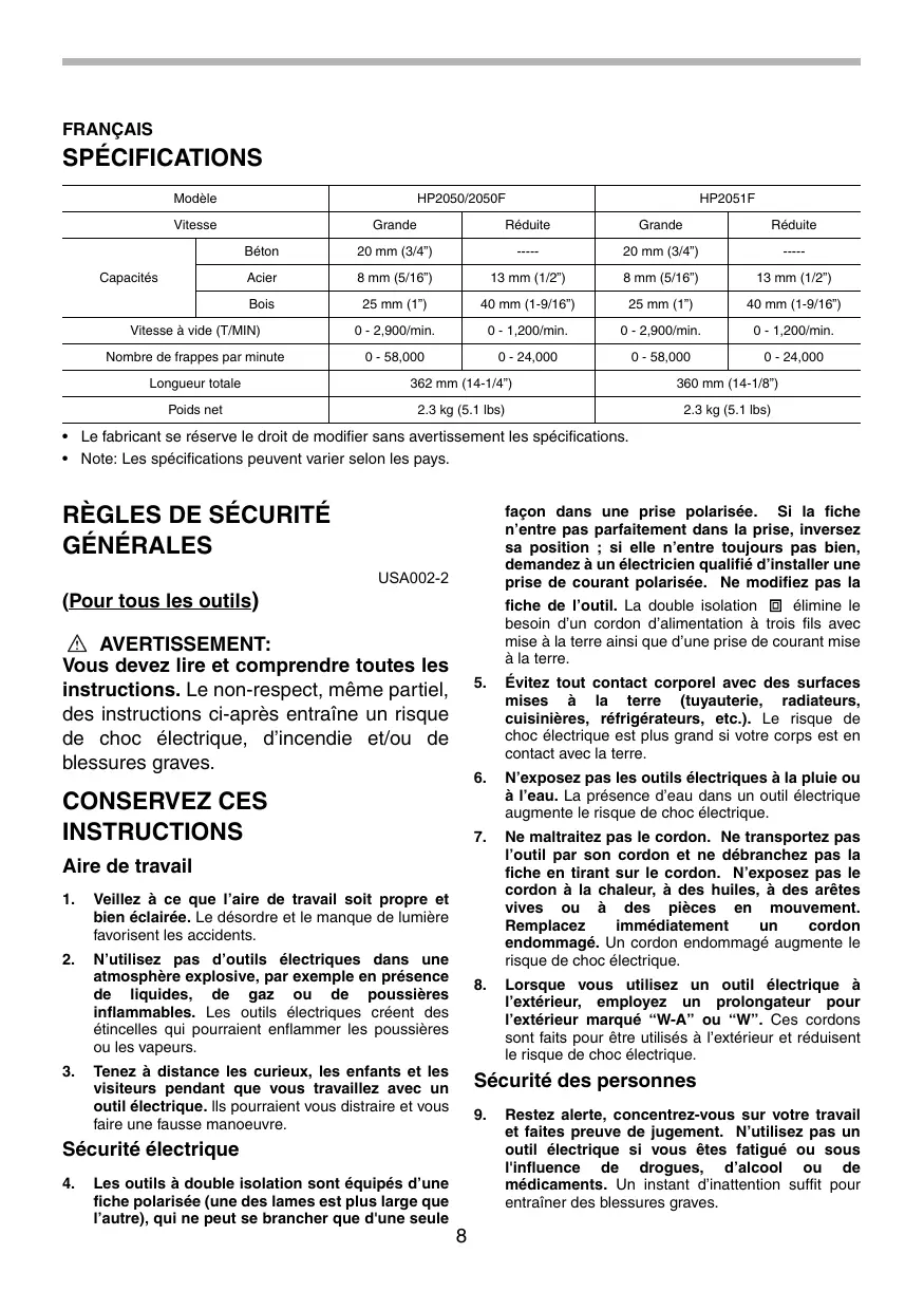 FRANÇAIS SPÉCIFICATIONS Modèle HP2050/2050F HP2051F Vitesse Grande Réduite Grande Réduite Béton 20 mm (34) = 20 mm (8/47) | — Capacités Acier 8 mm (5/16) 13 mm (1/27) 8 mm (5/6) 13 mm (1/27) Bois 25 mm (1) 40 mm (1-9/16") 25 mm (1°) 40 mm (1-9/16°) Vitesse à vide (T/MIN) 0 - 2,900/min. 0 - 1,200/min. 0 -2,900/min. 0 - 1,200/min. Nombre de frappes par minute 0-58,000 0-24,000 0-58,000 0-24,000 Longueur totale 862 mm (14-1/4") 860 mm (14-1/8") Poids net 2.3 kg (5. lbs) 23 kg (5.1 lbs) +_Le fabricant se réserve le droit de modifier sans avertissement les spécifications. + Note: Les spécifications peuvent varier selon les pays.