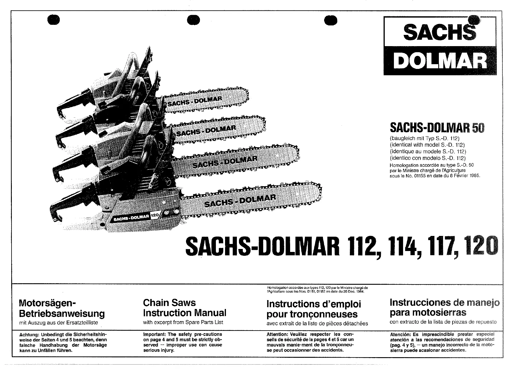 Faire le plein Carburant (grand bouchon) Mélange = 25 : 1, soit 25 litres d'essence normale pour un litre d'huile SAE 30, ce qui correspond à 40 cm° d'huile pour un litre d' ( utiliser de super, le taux mi 87 à 88 ROZ. Ne jamais faire te mélange dans le réservoir de la tronçonneuse. Pendant les premières 40 heures de travail ta tronçonneuse est en rodage; le mélange doit être de 20 : 1. SLta tronçonneuse n’a pas été utilisée pendant plusieurs jours et que le réservoir est plein, il convient de la secouer énergiquement avant la première mise en marche afin que le carburant soit parfaitement mélangé. L'huile deux-temps DOLMAR 40 : 1 est économique; lors du rodage = 30 : 1. Si la température exterieure est relativement basse, choisir une huile à viscosité adaptée. Huile de chaîne (petit bouchon) Il doit toujours y avoir suffisamment d'huile dans le réservoir; le contrôler fréquemment, car une bonne lubri- fication est très importante! Scier sans huile aurait pour conséquence à très brève éché- ance, la déterioration du guide et de a chaîne. Utiliser de préférence l'huile DOLMAR avec additif, ou encore, de l'huile normale SAË 30. Là encore à basse température choisir une huile à viscosité correspondant à la température. Se renseigner auprès des stations de service après-vente SACHS-DOLMAR. Ne jamais utiliser de vieille huile; la garantie tombe de plein droit, car la lubrification insuffisante et lencrassement de la pompe à huile et du dispositif de sciage engendrent alors une usure inutile et prématurée. 40:11 2554 1000 ccm (iLiter} 25cém{mi | 40ccmini) 5000 com (5 Liter) 125 com{mi) | 200 cem{mi} 40090 com {10 Lier {260 ccm ni) | 400 com mil} Llenado de depésitos Combustible (Tapén grande}. Mezcia para motores de dos tiempos 25 : 1 No empiear gasolina Super, usar solo gasolina de 85 octanos. No hacer la mezcla nunca en el depésito de la motosierra, ésta serä siempre insuficiente. Durante las primeras 40 horas de trabajo, para hacer el “rodaje”, mezciar 20 : 1 Si la motosierra, con el depésite lleno, ha estado varios dias en reposo, antes de poneria en marcha de nuevo, agitarta fuertemente (se consigue con ello de nuevo una buena mezcla de combustible). Se puede empiear acelte para motores de dos tiempos DOLMAR 46 : 1, segün las prescripciones descritas en la late. Durante el rodaje emplee 80 : 1. Con temperaturas ambientes extremas, se ha de elegir la visoo- sidad del aceite correspondiente. Informese en el servicio SACHS-DOLMAR. Aceite de cadena (Tapôn pequeño}. Siempre ha de haber el suficiente aceite en ei depésito. Comprobarla con frecuencie. Un buen engrase es muy importante. Serrar sin aceite, significa deteriorar, en un corto plazo de trabajo, la cade- na y la guia 6 predisponerlas a roturas. Le mejor es user — aceite especial DOLMAR con aditivo adherente 6 aceite normaldemotorSAE 80. Con temperaturas ambientes exiremas, se ha de eie- gir la viscosidad dei aceite correspondiente. Inférmese en el servicio SACHS-DOLMAR. No utilizarnunca aceite usado, va que se perderâla garantia de ia mâquina, puesto que una lubrifi- caciôn insuficiente y el uso de aceite sucio pro- ducen un desgaste prematuro en la bomba de aceite y la guia y cadena. LS 6