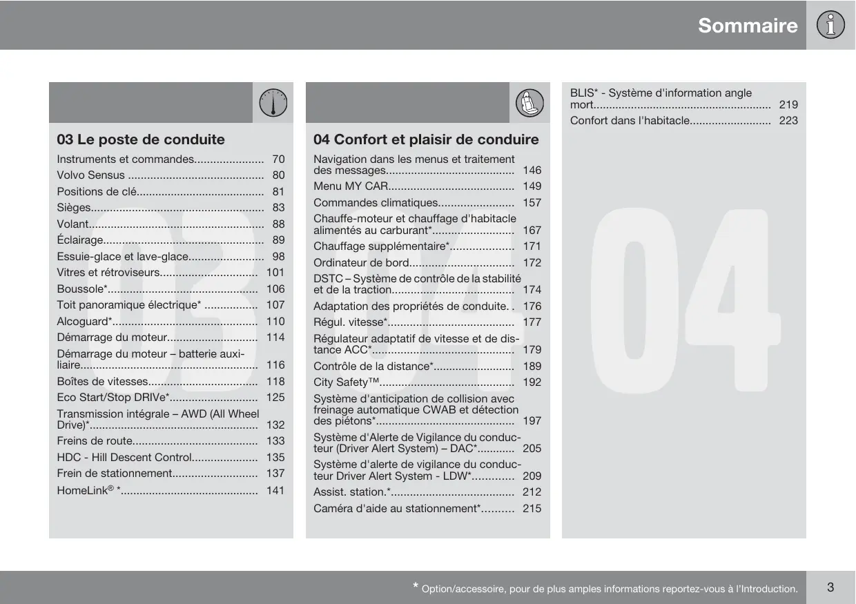 Nous vous souhaitons de nombreuses années de plaisir au volant de votre Volvo. La voiture a été conçue dans un souci de sécurité et de confort pour vous et vos passagers. Les Volvo se placent parmi les voitures les plus sûres au monde. Votre Volvo a également été conçue pour satisfaire aux exigences actuelles en matière de sécurité et de respect de l'environnement. Pour ajouter à votre plaisir, nous vous recommandons de vous familiariser avec l'équipement, les instructions et les informations de maintenance réunis dans le manuel de conduite et d'entretien. Sommaire