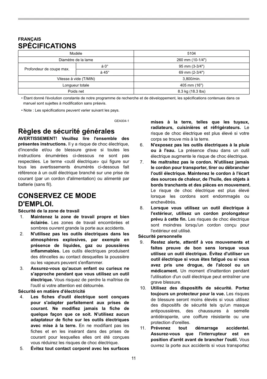 - Étant donné l'évolution constante de notre programme de recherche et de développement, les spécifications contenues dans ce manuel sont sujettes à modification sans préavis. + Note : Les spécifications peuvent varier suivant les pays. GEA0&1 Règles de sécurité générales AVERTISSEMENT! Veuillez ire l'ensemble des présentes instructions. |l y a risque de choc électrique, d'incendie etou de blessure grave si toutes les instructions énumérées ci-dessous ne sont pas respectées. Le terme <outil électrique» qui figure sur tous les avertissements énumérés ci-dessous fait référence à un outil électrique branché sur une prise de courant (par un cordon d'alimentation) ou alimenté par batterie (sans fil).