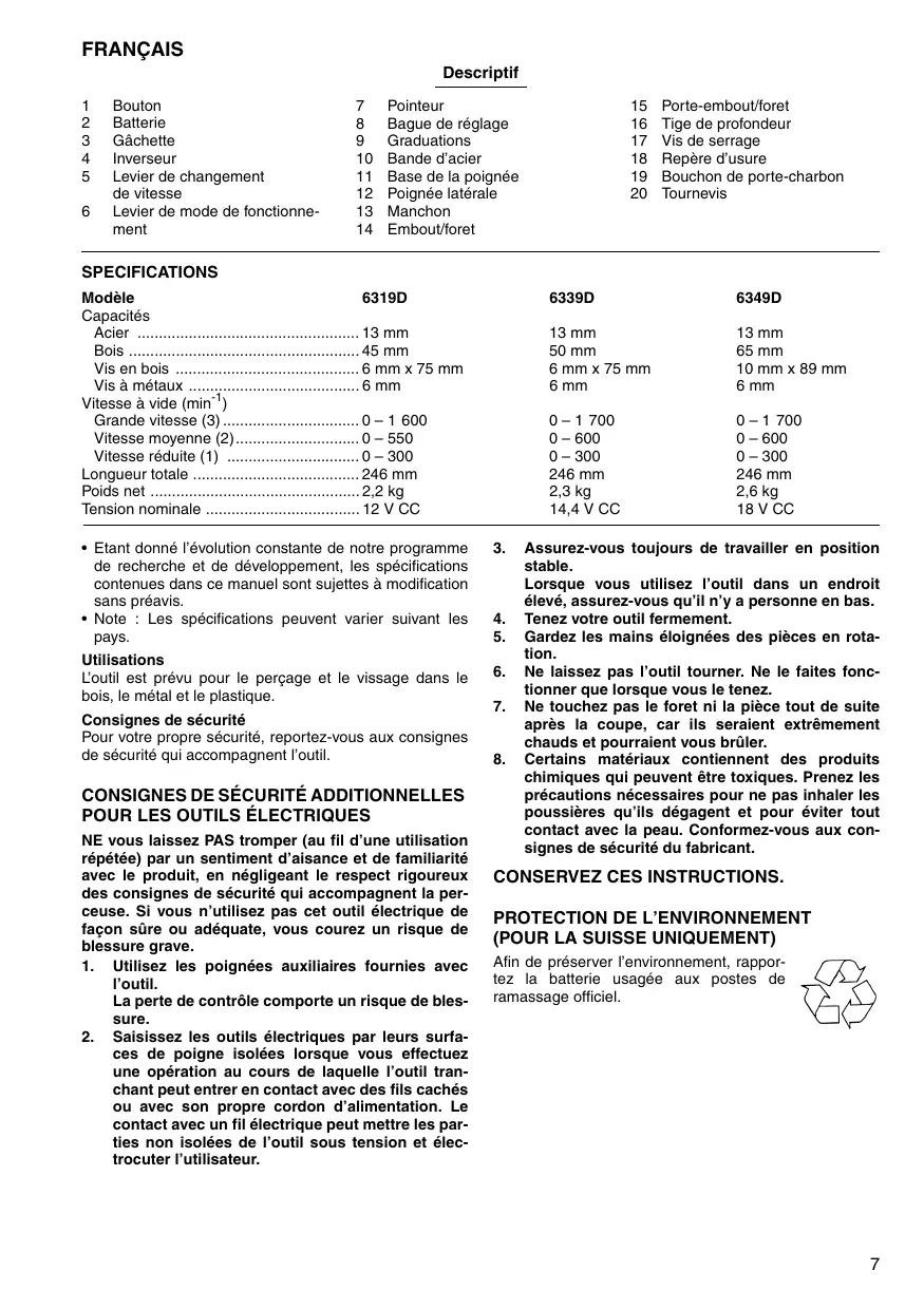FRANÇAIS Descriptif 1 Bouton 7 Pointeur 15. Porte-embout/foret 2 Batterie 8 Bague de réglage 16 Tige de profondeur 3 Gâchette 9 Graduations 17 Vis de serrage 4 Inverseur 10 Bande d'acier 18 Repère d'usure 5 Levier de changement 11. Base de la poignée 19 Bouchon de porte-charbon de vitesse 12. Poignée latérale 20 Tournevis 6 Levier de mode de fonctionne- 13 Manchon ment 14 Emboutoret SPECIFICATIONS Modèle 6319D Capacités Acier 13 mm Bois Vis en bois . Vis à métaux Vitesse à vide (min!) Grande vitesse (3) Vitesse moyenne (2) Vitesse réduite (1) Longueur totale Poids net . Tension nominale 45 mm 6 mm x 75 mm 6mm 0-1 600 -0-550 -0- 300 246 mm 2,2 kg .12VCC 6339D 6349D 13mm 13mm 50 mm 65 mm 6 mm x 75 mm 10 mm x 89 mm 6mm 6mm 0-1 700 0-1 700