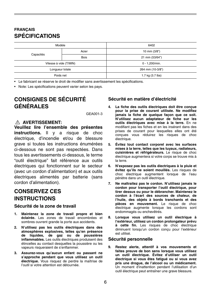 FRANÇAIS SPÉCIFICATIONS Modèle 6402 Acier 10 mm (3187 Capacités Bois 21 mm (531647 Vitesse à vide (T/MIN) 0-1,200/min. Longueur totale 264 mm (10-3487) Poids net 17 kg (8.7 1be) + Le fabricant se réserve le droit de modifier sans avertissement les spécifications. + Note: Les spécifications peuvent varier selon les pays.