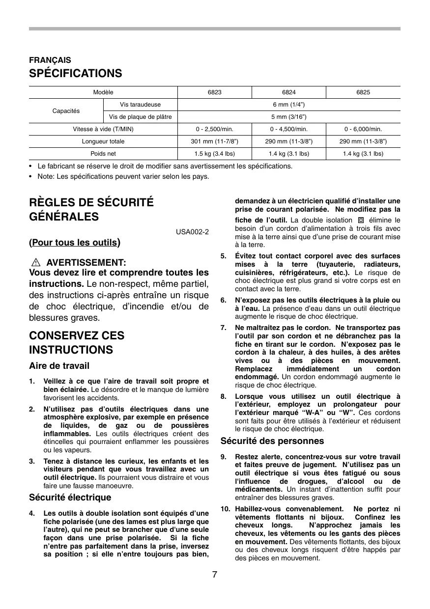 24. Pour la réparation d’un outil, n’employez que des pièces de rechange d’origine. Suivez les directives données à la section «ENTRETIEN» de ce manuel. L’emploi de pièces non autorisées ou le non-respect des instructions d’entretien peut créer un risque de choc électrique ou de blessures.