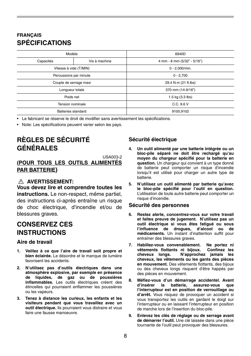 NE vous laissez PAS tromper (au fil d’une utilisation répétée) par un sentiment d’aisance et de familiarité avec le produit, en négligeant le respect rigoureux des consignes de sécurité qui accompagnent le tournevis à chocs sans fil. L’utilisation non sécuritaire ou incorrecte de cet outil comporte un risque de blessure grave.
