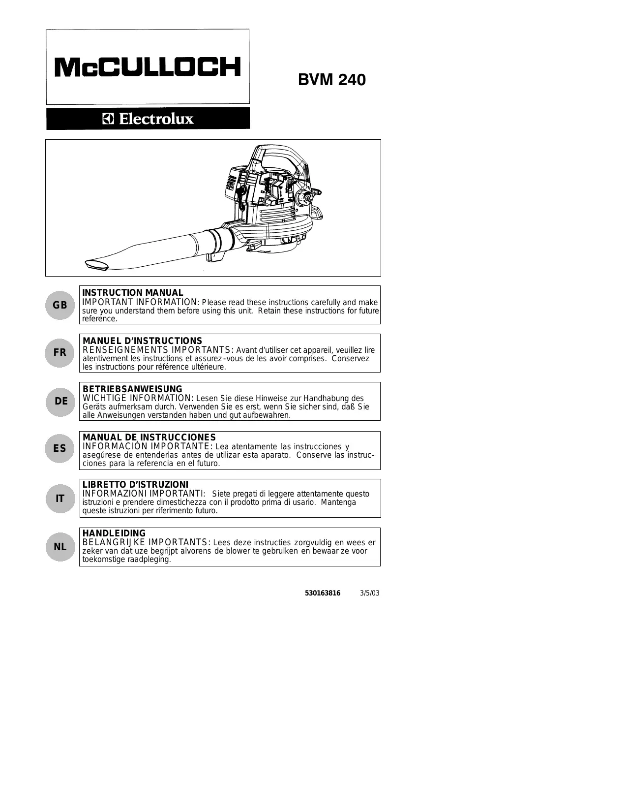 Retrouvez gratuitement la notice de l'appareil BVM 240 24CC MCCULLOCH au format PDF.