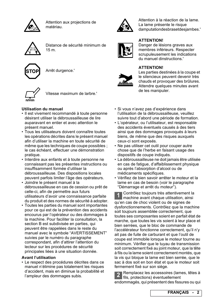 Attention à la réaction de la lame. La lame présente le risque damputationdesbrasetdesjambes.' Attention aux projections de matériau. 15 m ATTENTION! Danger de lésions graves aux membres inférieurs. Respecter scrupuleusement les indications du manuel dinstructions.' Distance de sécurité minimum de 15 m. ATTENTION! Les parties destinées à la coupe et le silencieux peuvent devenir très chauds et provoquer des brûlures. Attendre quelques minutes avant de les manipuler. Arrêt durgence.' Vitesse maximum de larbre.' Utilisation du manuel