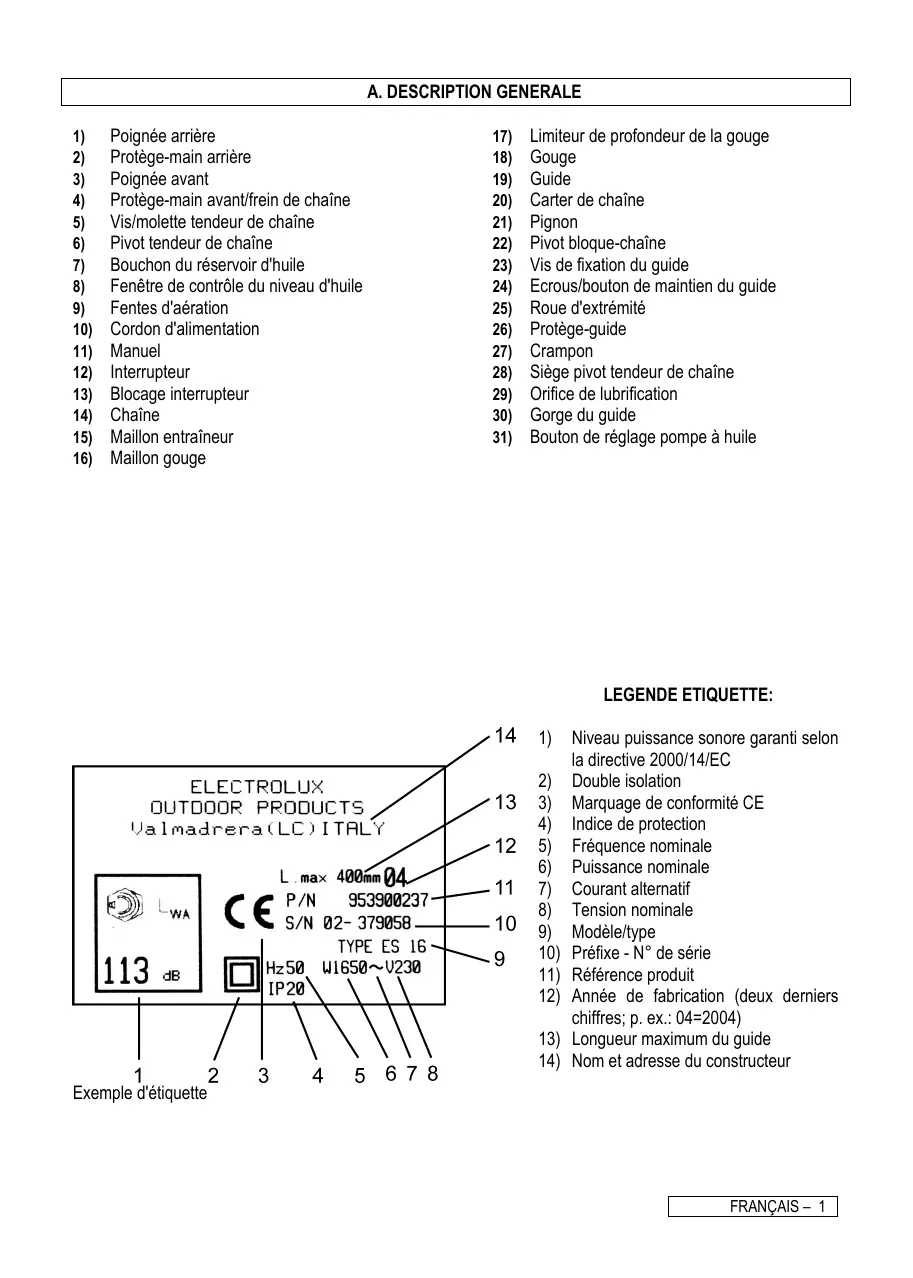10) 11) 12) 13) 14) 15) 16) Poignée arrière Protège-main arrière Poignée avant Protège-main avant/frein de chaîne Vis/molette tendeur de chaîne Pivot tendeur de chaîne Bouchon du réservoir d'huile Fenêtre de contrôle du niveau d'huile Fentes d'aération Cordon d'alimentation Manuel Interrupteur Blocage interrupteur Chaîne Maillon entraîneur Maillon gouge 17) 18) 19) 20) 21) 22) 23) 24) 25) 26) 27) 28) 29) 30) 31) Limiteur de profondeur de la gouge Gouge Guide Carter de chaîne Pignon Pivot bloque-chaîne Vis de fixation du guide Ecrous/bouton de maintien du guide Roue d'extrémité Protège-guide Crampon Siège pivot tendeur de chaîne Orifice de lubrification Gorge du guide Bouton de réglage pompe à huile LEGENDE ETIQUETTE: