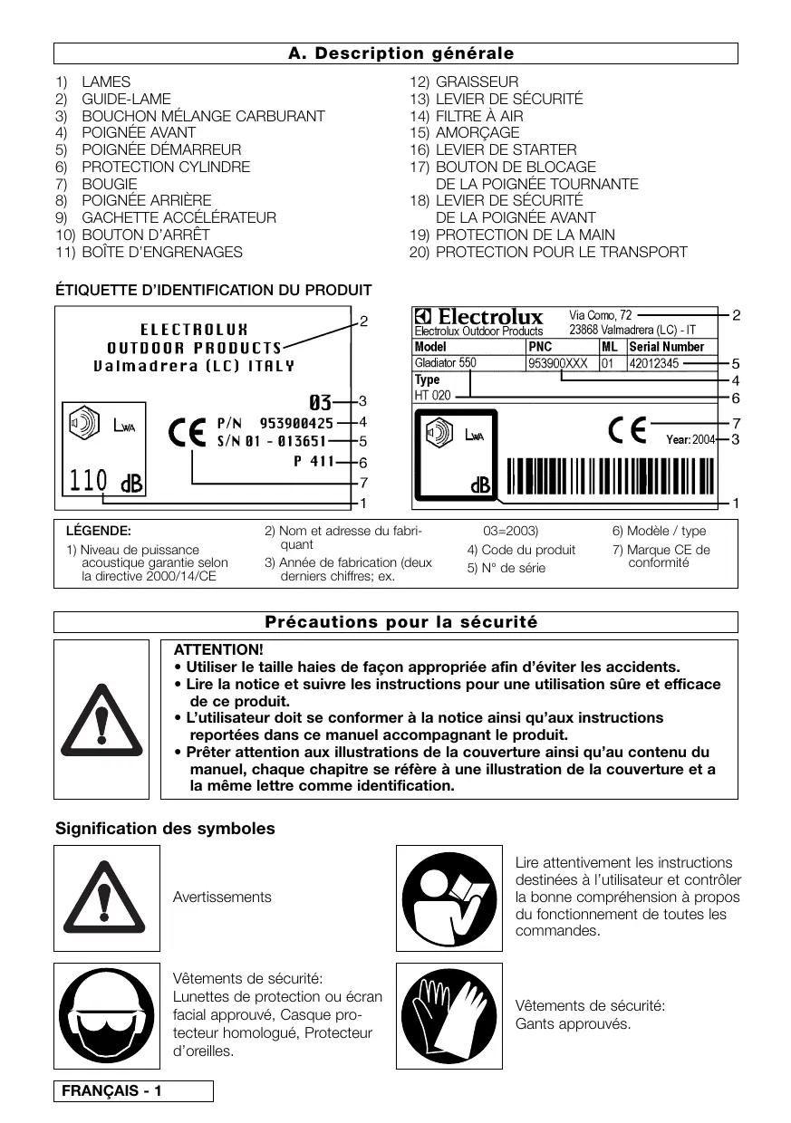 ATTENTION! ser le taille haies de façon appropriée afin d'éviter les accidents. e la notice et suivre les instructions pour une utilisation sûre et efficace de ce produit. + L'utilisateur doit se conformer à la notice ainsi qu’aux instructions reportées dans ce manuel accompagnant le prod + Prêter attention aux illustrations de la couverture ainsi qu’au contenu du manuel, chaque chapitre se réfère à une illustration de la couverture et a la même lettre comme identification. Signification