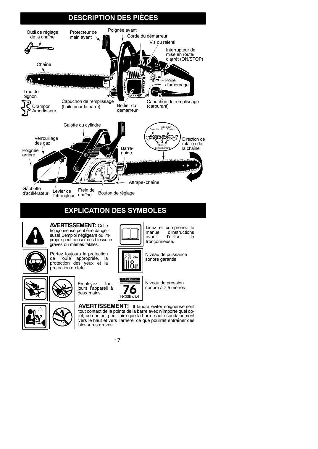 Lisez et comprenez le manuel d’instructions avant d’utiliser tronçonneuse. tronçonneuse peut être dangereuse! L’emploi négligeant ou impropre peut causer des blessures graves ou mêmes fatales. Portez toujours la protection de l’ouïe appropriée, la protection des yeux et la protection de tête. Niveau de puissance sonore garantie Niveau de pression sonore à 7,5 mètres Employez toujours l’appareil à deux mains. AVERTISSEMENT! Il faudra éviter soigneusement tout contact de la pointe de la barre avec n’importe quel objet; ce contact peut faire que la barre saute soudainement vers le haut et vers l’arrière, ce que pourrait entraîner des blessures graves.