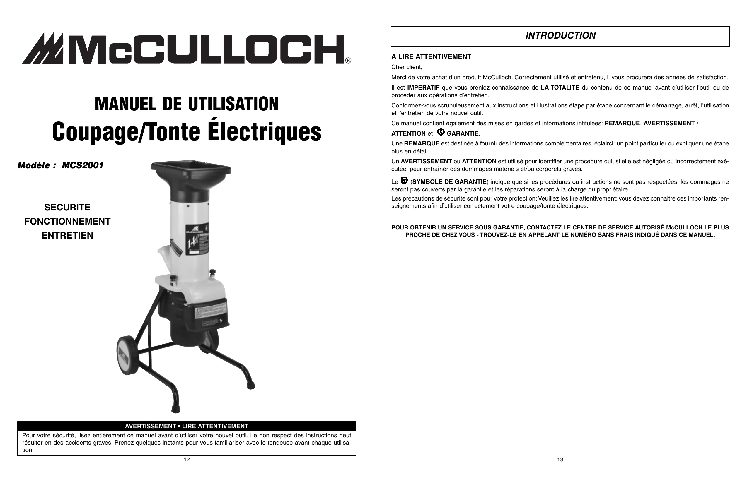 (SYMBOLE DE GARANTIE) indique que si les procédures ou instructions ne sont pas respectées, les dommages ne seront pas couverts par la garantie et les réparations seront à la charge du propriétaire. Les précautions de sécurité sont pour votre protection; Veuillez les lire attentivement; vous devez connaitre ces importants renseignements afin d’utiliser correctement votre coupage/tonte électriques. SECURITE FONCTIONNEMENT POUR OBTENIR UN SERVICE SOUS GARANTIE, CONTACTEZ LE CENTRE DE SERVICE AUTORISÉ McCULLOCH LE PLUS PROCHE DE CHEZ VOUS - TROUVEZ-LE EN APPELANT LE NUMÉRO SANS FRAIS INDIQUÉ DANS CE MANUEL. ENTRETIEN