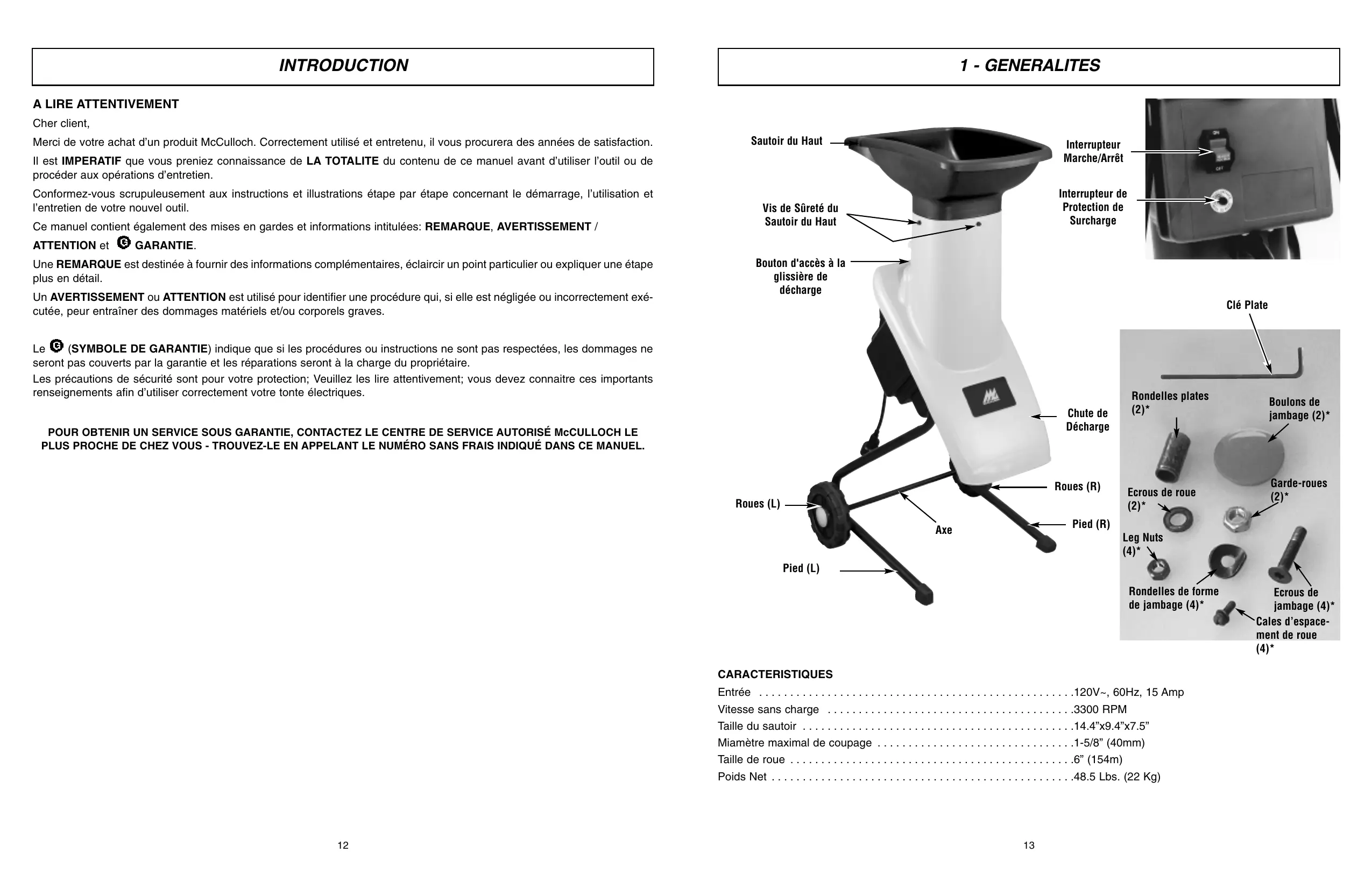 faites. Utilisez votre sens commun quand vous utilisez un appareil électrique. N’utilisez pas l’ap- pareil par moments de fatigue ou sous l’influence de drogues, alcool ou médicaments. Un instant d’inattention peut causer de graves blessures. Eviter les démarrages accidentels: Ne déplacez pas l'équipement électrique branché avec le doigt sur le commutateur. Soyez certain que le commutateur est sur arrêt quand vous branchez. Ne pas tenir l’appareil à bout de bras: Veuillez à toujours bien être campé et gardez toujours votre équilibre. Une bonne posture et équilibre vous permettent de mieux contrôler l’outil en toutes circonstances. Aucun accessoire ou pièce n’est nécessaire avec cet outil de jardin. Leur utilisation n’est pas recommandée car cela risque d’augmenter les risques de blessures N'utilisez pas la force. L’utiliser à la puissance conçue et il aura une meilleure performance et les risques de blessure seront réduites. Débrancher l’outil avant de l’ajuster, changer les accessoires ou le remiser. Cela empêche de faire démarrer l’outil accidentellement. Stockez les outils à l'intérieur. Lorsqu’il n’est pas en utilisation, remiser l’appareil dans un endroit sec, inaccessible aux enfants Entretenez les outils. Garder la partie tranchante propre et aiguisée pour une performance optimale et un moindre risque de blessures. Suivre les instructions de lubrification et de changements de pièces. Contrôler le cordon d’alimentation de votre taille-haie périodiquement, et si endommagé, le faire réparer par un service après vente agréé. Vérifier les prolongateurs périodiquement et les remplacer si endommagés. Garder les poignées sèches, propres et exemptes de toute trace d’huile ou graisse. Vérifier les pièces endommagées: Avant toute utilisation de l’outil, toute pièce endommagée doit être soigneusement inspectée afin de déterminer si son fonctionnement est adéquat à sa fonction prévue. Contrôler le montage, l’alignement et les fixations des pièces mobiles, vérifier qu’il n’y a pas de pièces cassées ou tout autre problème qui affecteraient son fonctionnement. Toute pièce endommagée devrait être réparée correctement ou remplacée par un centre de service agréé sauf indication contraire dans ce manue. Veillez particuliérement à ce que les matiéres devant être broy es ne contiennent pas de métal, de pierres, de bouteilles, de canettes ou tout autre objet étranger. Ne mettez pas vos mains ou toute autre partie du corps à l'intérieur de la chambre de chargement ou de la descente de déchargement, veillez aussi à ce que les habits n'entrent pas à l'intérieur de la chambre ou de la descente lorsque la machine fonctionne. Portez des gants lorsque vous vous servez de la machine. Avant de mettre la machine en route, assurez-vous que toutes les vis et autres dispositifs d'assemblage sont correctement fixés. La machine doit être utilisée seulement sur un sol plan et ferme. Avant de mettre la machine en route assurez-vous que la chambre de chargement est vide. Le moteur doit être propre de tout d bris ou de tout autre dépôt. Maintenez toutes les protections et tous les déflecteurs en bon état de marche. A tout moment restez à l'écart de la descente de déchargement. Ne vous approchez pas trop et gardez votre visage et votre corps à l'écart de l'ouverture de chargement. Ne tirez jamais la machine par son fil d'alimentation et maintenez le fil à l'écart de l'eau et de tout objet coupant. Débranchez le fil d'alimentation lorsque la machine n'est pas utilisée. Si la machine venait à se bloquer, éteignez le moteur, débranchez le fil d'alimentation, assurez-vous que toutes les parties mobiles sont complètement arrêtées avant de dégager les d bris responsables du bourrage. Assurez-vous que le fil d'alimentation est toujours en bon état. Un fil comportant une isolation défectueuse est extrêmement dangereux et peut occasionner un incendie, une électrocution ou de sévères blessures corporelles. L'utilisation de n'importe quel outil peut conduire à la projection de corps étrangers dans vos yeux, pouvant aboutir à des dommages graves aux yeux. Avant d'utiliser un outil électrique, portez toujours des lunettes de sécurité ou des verres de sécurité avec des protections latérales et une protection complète du visage quand nécessaire. Nous recom- mandons un grand masque de sécurité pour la vision, à utiliser par-dessus des lunettes ou des verres de sécurité standard avec protections latérales. Une REMARQUE sert à transmettre des informations complémentaires, à mettre en évidence une explication particulière, ou à étendre une instruction. Un AVERTISSEMENT identifie une procédure qui risque de causer de graves blessures corporelles ou de graves dommages à l'appareil et/ou les deux si elle n'est pas respectée ou si elle est mal effectuée. (SYMBOLE DE GARANTIE) indique que si les procédures ou instructions n'ont pas été respectées, les dommages causés annuleront la garantie et que les réparations seront à la charge du propriétaire. Pour des services autres que ceux d'entretien à effectuer par l'utilisateur, s'adresser à un Centre de réparation agréé McCulloch. La garantie du fabricant sera nulle et non avenue si des dommages ou des conditions causés par de mauvaises pratiques d'entretien rendent le produit inutilisable. POUR TOUT ENTRETIEN OU SERVICE AU TITRE DE LA GARANTIE, s'adresser à un Centre de service agréé McCulloch dont le nom figure sous la rubrique «SCIES» des pages jaunes de l'annuaire. Ne placez jamais les mains dans la glissière de décharge sous peine de blessure grave (Figure 2-1). Il est fortement recommandé de respecter les consignes de sécurité personnelle pour réduire les risques d'accident ou de blessures (Figure 2-2). Placez les jambages sur le moyeu. Mettez les cales d’espacement de roue et les roues aux ex