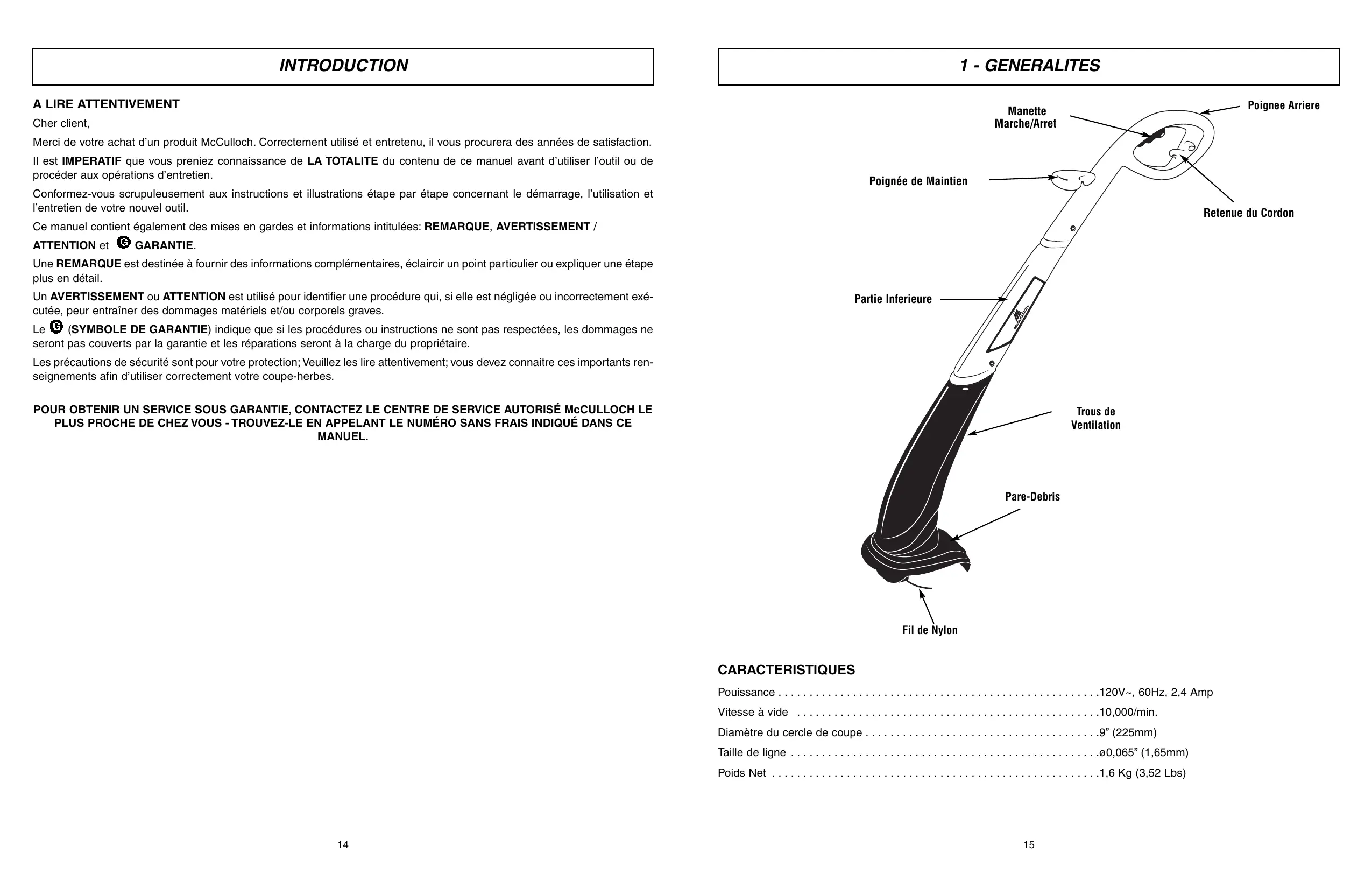 Merci de votre achat d'un produit McCulloch. Correctement utilisé et entretenu, il vous procurera des années de satisfaction.