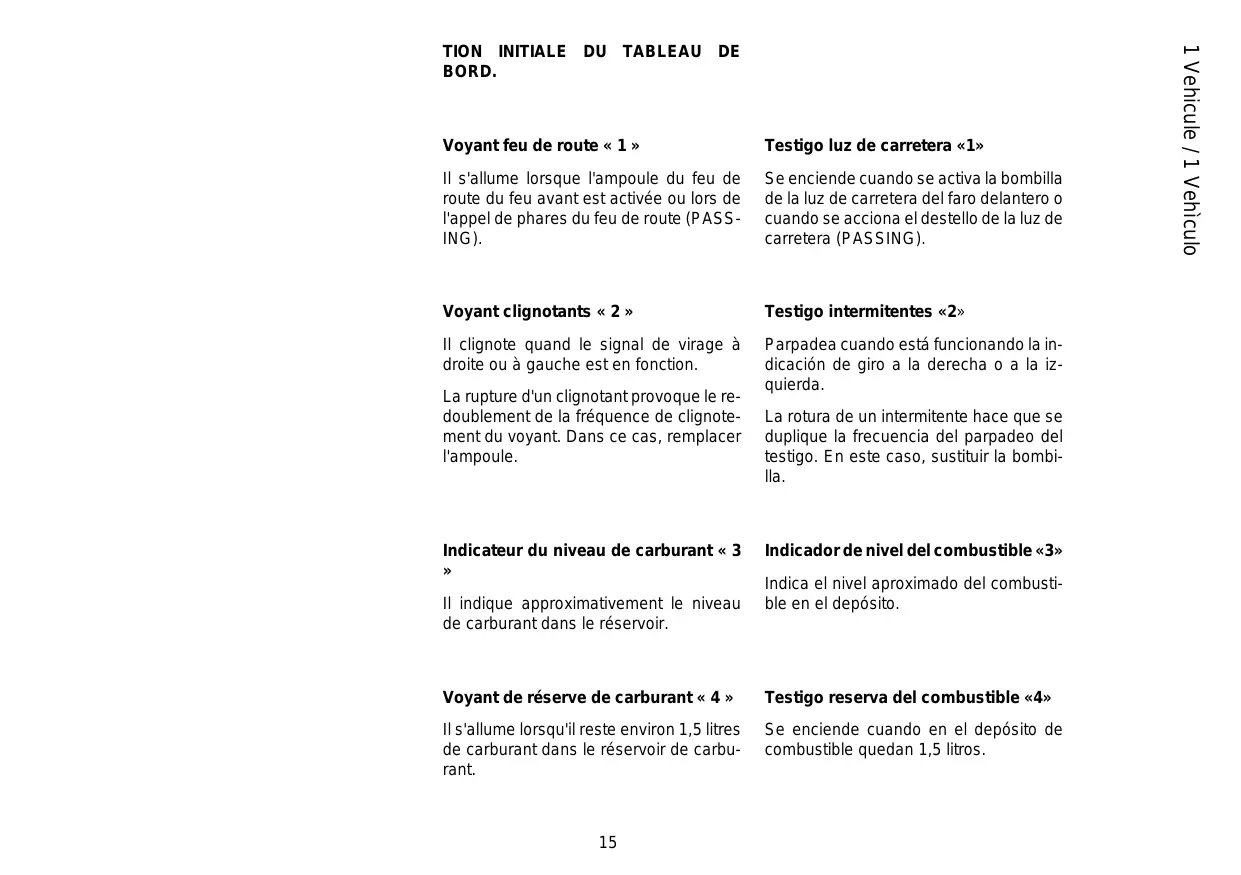 Voyant feu de route « 1 » Testigo luz de carretera «1» Il s'allume lorsque l'ampoule du feu de route du feu avant est activée ou lors de l'appel de phares du feu de route (PASSING). Se enciende cuando se activa la bombilla de la luz de carretera del faro delantero o cuando se acciona el destello de la luz de carretera (PASSING). Voyant clignotants « 2 » Testigo intermitentes «2» Il clignote quand le signal de virage à droite ou à gauche est en fonction. Parpadea cuando está funcionando la indicación de giro a la derecha o a la izquierda. La rupture d'un clignotant provoque le redoublement de la fréquence de clignotement du voyant. Dans ce cas, remplacer l'ampoule. Indicateur du niveau de carburant « 3 Il indique approximativement le niveau de carburant dans le réservoir. La rotura de un intermitente hace que se duplique la frecuencia del parpadeo del testigo. En este caso, sustituir la bombilla. Indicador de nivel del combustible «3» Indica el nivel aproximado del combustible en el depósito. Voyant de réserve de carburant « 4 » Testigo reserva del combustible «4» Il s'allume lorsqu'il reste environ 1,5 litres de carburant dans le réservoir de carburant. Se enciende cuando en el depósito de combustible quedan 1,5 litros.