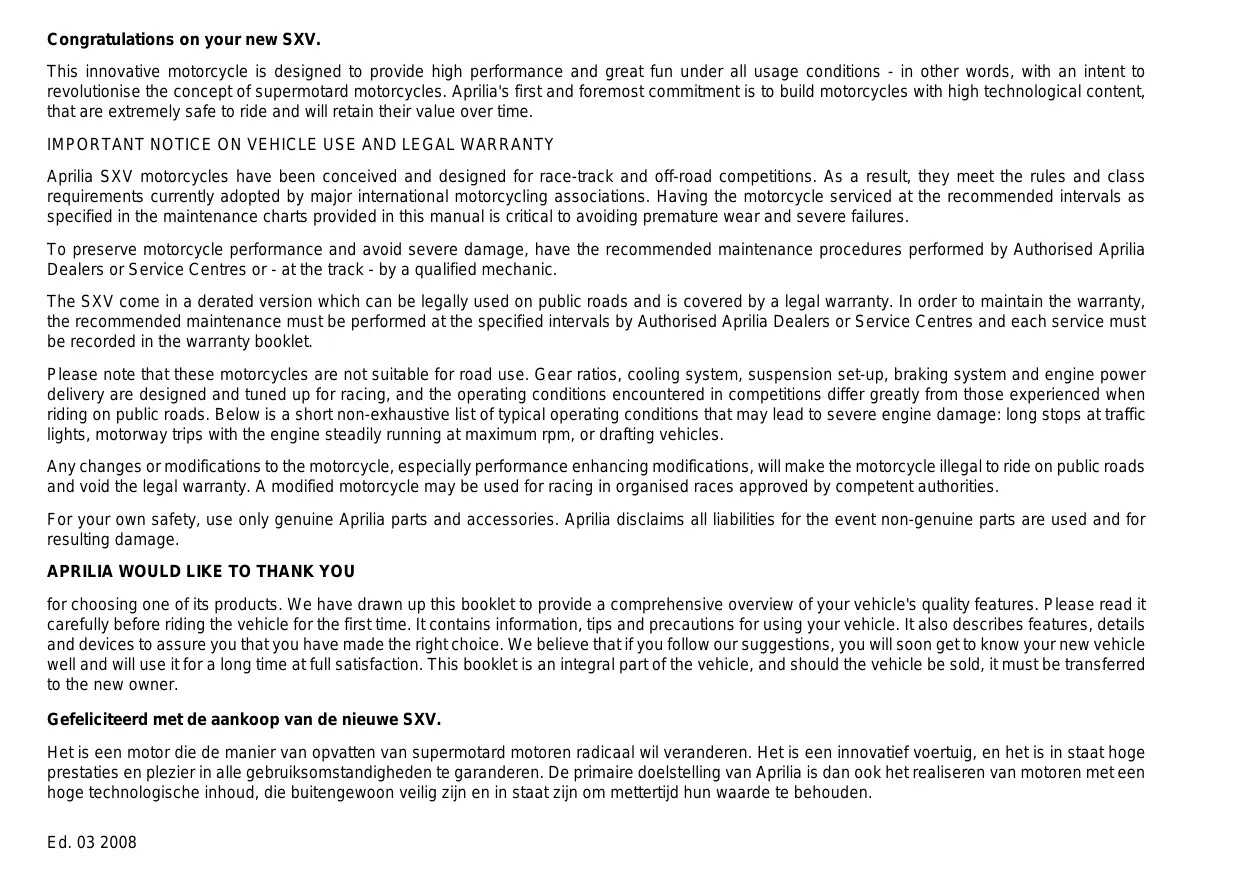 Téléchargez la notice de votre Moto tout-terrain au format PDF gratuitement ! Retrouvez votre notice SXV 5.5 - APRILIA et reprennez votre appareil électronique en main. Sur cette page sont publiés tous les documents nécessaires à l'utilisation de votre appareil SXV 5.5 de la marque APRILIA.