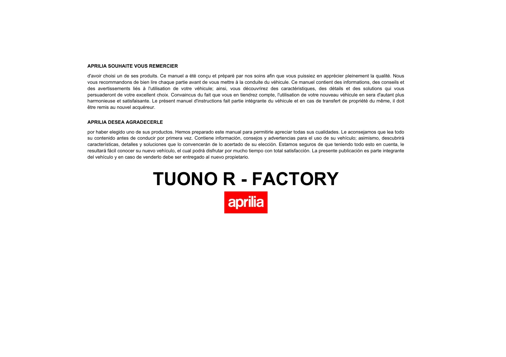 Retrouvez gratuitement la notice de l'appareil TUONO 1000 R FACTORY APRILIA au format PDF.