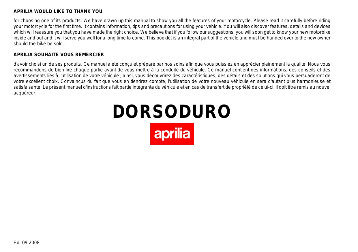 d'avoir choisi un de ses produits. Ce manuel a été conçu et préparé par nos soins afin que vous puissiez en apprécier pleinement la qualité. Nous vous recommandons de bien lire chaque partie avant de vous mettre à la conduite du véhicule. Ce manuel contient des informations, des conseils et des avertissements liés à l'utilisation de votre véhicule ; ainsi, vous découvrirez des caractéristiques, des détails et des solutions qui vous persuaderont de votre excellent choix. Convaincus du fait que vous en tiendrez compte, l'utilisation de votre nouveau véhicule en sera d'autant plus harmonieuse et satisfaisante. Le présent manuel d'instructions fait partie intégrante du véhicule et en cas de transfert de propriété de celui-ci, il doit être remis au nouvel acquéreur. DORSODURO Ed. 09 2008 The instructions contained in this booklet were written to provide a simple and clear guide for use of the vehicle. The manual also details routine maintenance procedures and regular checks that should be carried out on the vehicle at an authorized aprilia Dealer or Workshop, as well as instructions for some simple repairs. Procedures not described in detail here require the use of special tools and/or specific technical knowledge: we therefore advise you to contact an authorized aprilia Dealer or Workshop if you need them carried out. Ce manuel d'instructions a été conçu principalement comme un guide d'utilisation simple et clair. Ce manuel aborde également les opérations de petit entretien et les contrôles périodiques auxquels le véhicule doit être soumis chez les concessionnaires ou garages agréés aprilia. Ce livret contient, en outre, les instructions pour effectuer de petites réparations. Les opérations non décrites de manière explicite dans cette publication exigent des outillages particuliers et/ou de connaissances techniques spécifiques; Pour leur exécution, il est donc conseillé de s'adresser aux concessionnaires ou garages agréés aprilia.