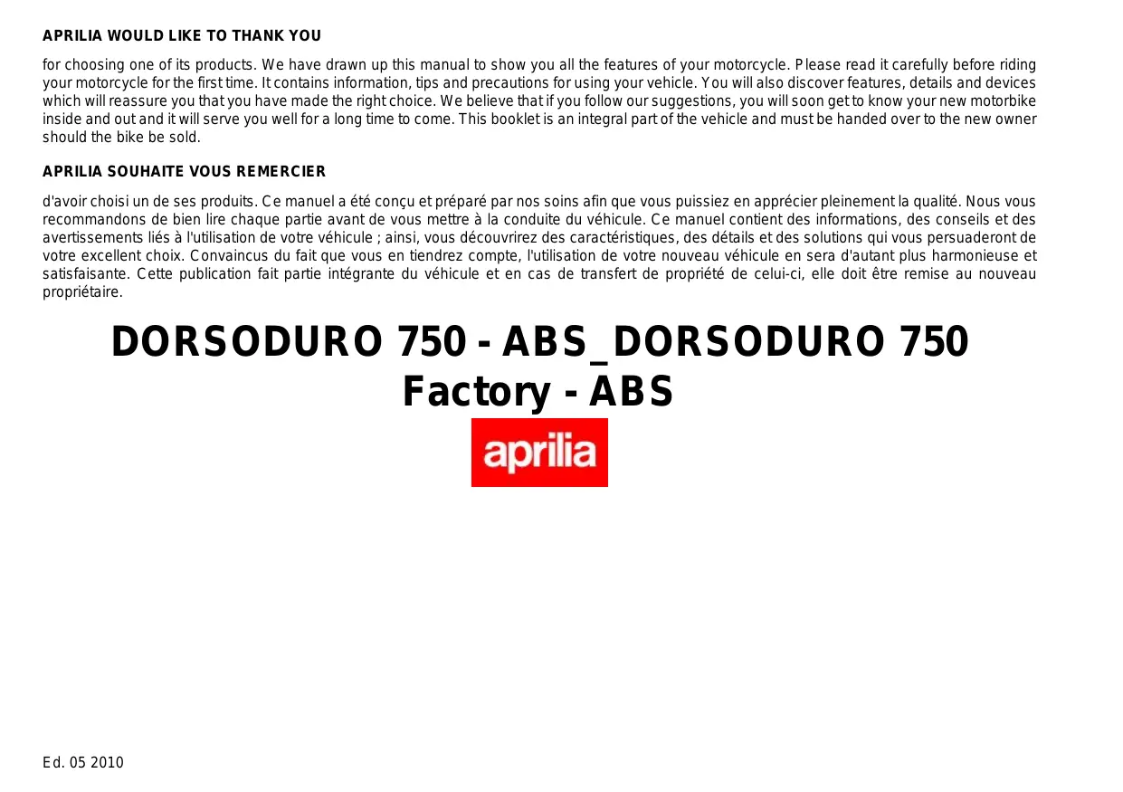 Factory - ABS Ed. 05 2010 The instructions contained in this booklet were written to provide a simple and clear guide for use of the vehicle. The manual also details routine maintenance procedures and regular checks that should be carried out on the vehicle at an authorized Aprilia Dealer or Workshop, as well as instructions for some simple maintenance items. Procedures not described in detail here require the use of special tools and/or specific technical knowledge: we therefore advise you to contact an authorized Aprilia Dealer or Workshop if you need them carried out. The vehicles are supported by the Aprilia New Vehicle Limited Warranty. This warranty covers the vehicles for defects in material and workmanship for the period of two years with no mileage limitation. As with any warranty, there are a number of exclusions; areas, situations, activities, care, treatment, and/or abuse where the warranty does not and will not cover the cost of parts and/or labor to complete a repair. One of the exclusions of this warranty is if the motorcycle is used in organized competitive events, Track Days or other closed course "racing" activities. Aprilia understands however that some vehicle owners - although fully aware of the above specified exclusion - may desire to take part in these events and activities. With this in mind Aprilia has provided information in this manual including, but not limited to, the proper racing set up of the motorcycle in the areas of suspension, ignition mapping selection, oil level checks and maintenance intervals. Ce manuel d'instructions a été conçu principalement comme un guide d'utilisation simple et clair. Ce manuel aborde également les opérations de petit entretien et les contrôles périodiques auxquels le véhicule doit être soumis chez les concessionnaires ou garages agréés Aprilia. Ce livret contient, en outre, les instructions pour effectuer de petites réparations. Les opérations non décrites de manière explicite dans cette publication exigent des outillages particuliers et/ou de connaissances techniques spécifiques ; Pour leur exécution, il est donc conseillé de s'adresser aux concessionnaires ou garages agréés Aprilia. Les véhicules sont couverts par la Garantie Limitée Aprilia pour Véhicules Neufs. Cette garantie couvre les véhicules pour des défauts inhérents au matériel et à la main-d'oeuvre pour une durée de deux ans sans aucune limite de kilométrage. Comme pour toute garantie, un certain nombre d'exclusions subsiste ; Les zones, les situations, les activités, l'entretien, le traitement et/ou l'utilisation non conforme sont autant de cas pour lesquels la garantie ne couvrira pas le coût des pièces de rechange et/ou de la main-d'oeuvre nécessaire à une réparation complète. Une des exclusion de cette garantie s'applique si jamais le motocycle est utilisé lors d'événements de sport de haut niveau organisés, Track Days ou d'autres activités de sport de haut niveau en circuit fermé. Aprilia comprend toutefois que certains détenteurs du véhicule, bien que totalement conscients de l'exclusion mentionnée plus haut - puissent vouloir participer à ces évènements et à ces activités. p> Ayant à l'esprit ce dernier aspect de la garantie, Aprilia a trouvé bon de vous fournir aussi des informations relatives à ceci dans ce manuel, concernant (mais pas uniquement limité à cela) un équipement spécialement adapté à la compétition pour le motocycle pour les suspensions, la sélection de cartographie de l'injection, les contrôles du niveau de l'huile et les intervalles d'entretien.