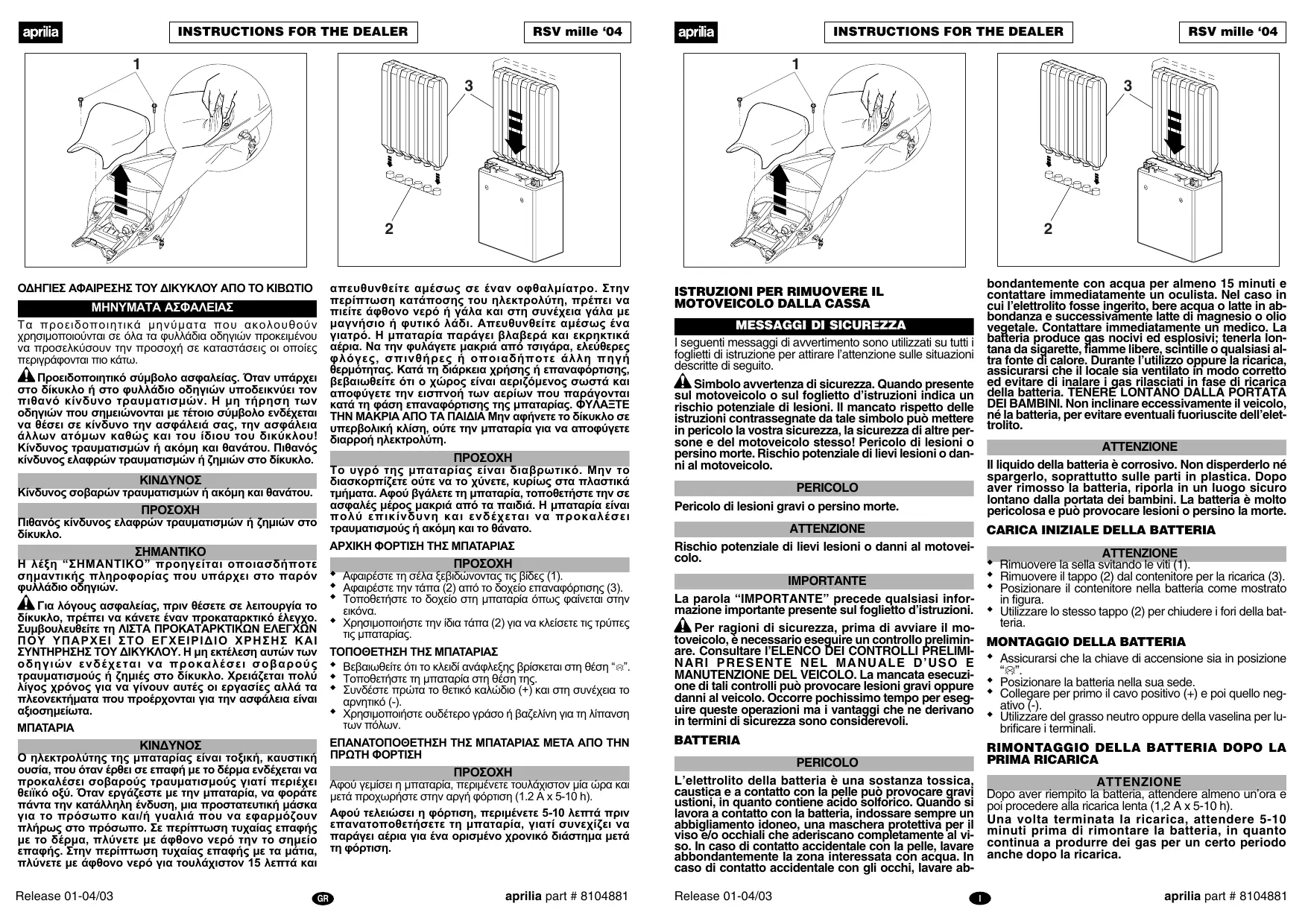 PELIGRO de haber quitado la batería, colocarla en un lugar segPeligro de lesiones graves o incluso la muerte. uro, lejos del alcance de los niños. La batería es muy ATENCIÓN peligrosa y puede provocar lesiones e incluso la Riesgo potencial de leves lesiones o daños a la moto- muerte cicleta. PRIMERA CARGA DE LA BATERÍA IMPORTANTE ATENCIÓN La palabra “IMPORTANTE” precede cualquier infor- ◆ mación importante que se encuentra en el folleto de ◆ Quitar el asiento destornillando el tornillo (1). Quitar el tapón (2) del contenedor para la recarga (3). instrucciones. ◆ Colocar el contenedor en la batería, como ilustra la figuPor razones de seguridad, antes de arrancar la ra. motocicleta, es necesario realizar un control prelimi- ◆ Utilizar el mismo tapón (2) para cerrar los agujeros de la nar. Consultar la LISTA DE LOS CONTROLES PREbatería. LIMINARES QUE SE ENCUENTRA EN EL MANUAL DE USO Y MANTENIMIENTO DEL VEHÍCULO. El in- MONTAJE DE LA BATERÍA cumplimiento de dichos controles puede provocar le- ◆ Asegurarse que la llave de encendido esté en posición siones graves o daños al vehículo. Se necesita muy “K”. poco tiempo para realizar estas operaciones, pero las ◆ Colocar la batería en su alojamiento. ◆ ventajas que derivan en términos de seguridad, son Conectar primero el cable positivo (+) y luego el negaconsiderables. tivo (-). ◆ Utilizar grasa neutra o vaselina para lubricar los termiBATERÍA nales. PELIGRO MONTAJE DE LA BATERÍA LUEGO DE LA El electrolito de la batería es una sustancia tóxica, cáustica y en contacto con la piel puede provocar PRIMERA RECARGA graves quemaduras, porque contiene ácido sulfúrico. ATENCIÓN Cuando se trabaja en contacto con la batería, utilizar Luego de haber cargado la batería, esperar por lo menos siempre indumentaria adecuada, máscara protectora una hora y luego proceder con la recarga lenta (1,2 A x 5para la cara y/o anteojos que se adhieran completa- 10 h). Una vez terminada la recarga, esperar 5-10 mente a la cara. En caso de contacto accidental con la minutos antes de montar nuevamente la batería, piel, lavar abundantemente la zona interesada con porque sigue produciendo gases por un determinado agua. En caso de contacto accidental con los ojos, período de tiempo aún luego de la recarga. ◆ ) en dan de kabel met de negatieve pool (-). ◆ Smeer de contacten met neutraal vet of vaseline.