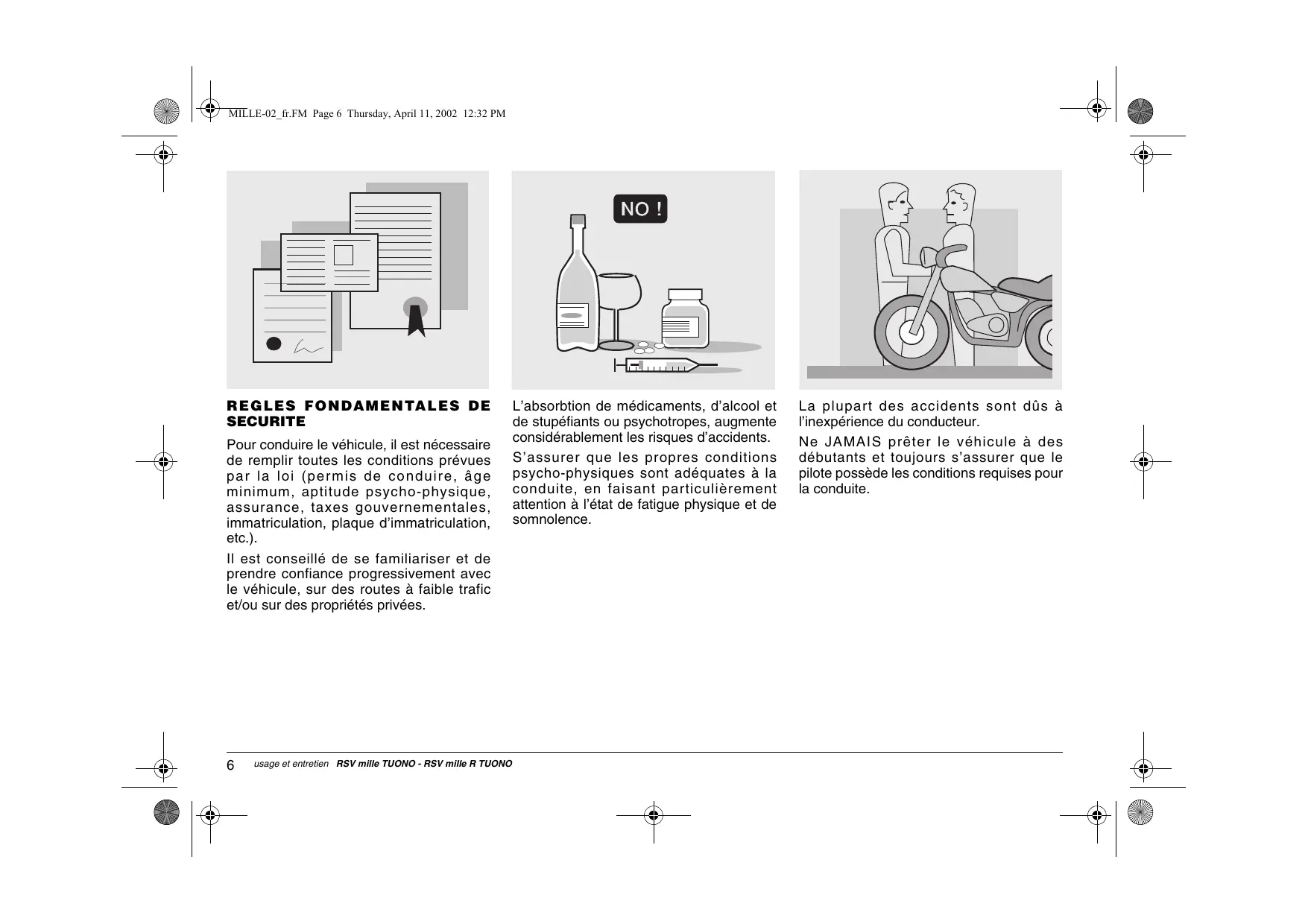 Importateurs .............................................. 116-117 SCHEMA ELECTRIQUE RSV mille TUONO - RSV mille R TUONO ....... 118 SCHEMA ELECTRIQUE - RSV mille TUONO RSV mille R TUONO .................................. 120 MILLE-02_fr.FM Page 5 Thursday, April 11, 2002 12:32 PM conduite en sécurité MILLE-02_fr.FM Page 6 Thursday, April 11, 2002 12:32 PM RE GLES FONDAME N TA LES DE SECURITE Pour conduire le véhicule, il est nécessaire de remplir toutes les conditions prévues par la l oi (permis de cond uire, âge minimum, aptitude psycho-physique, assurance, taxes gouvernementales, immatriculation, plaque d’immatriculation, etc.). Il est conseillé de se familiariser et de prendre confiance progressivement avec le véhicule, sur des routes à faible trafic et/ou sur des propriétés privées.