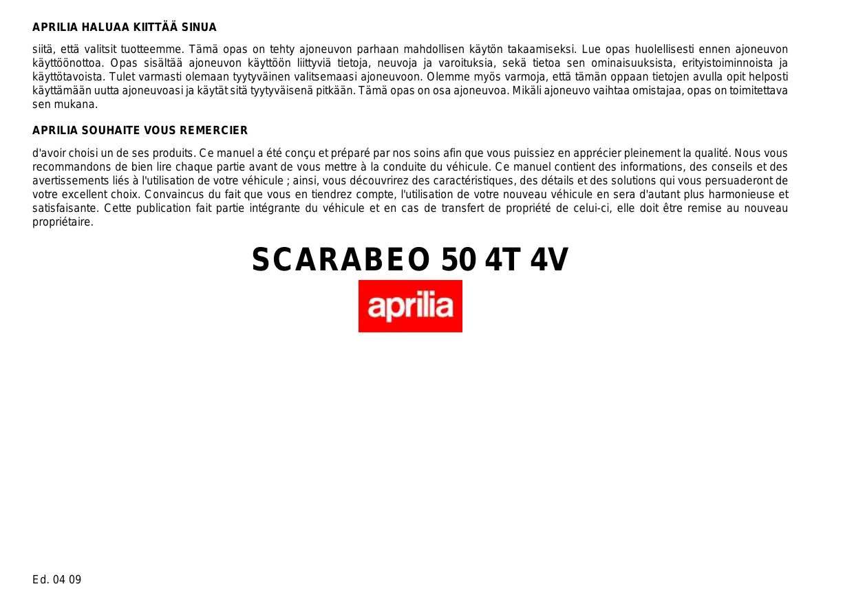 SCARABEO 50 4T 4V - Scooter APRILIA - Notice d'utilisation et mode d'emploi gratuit