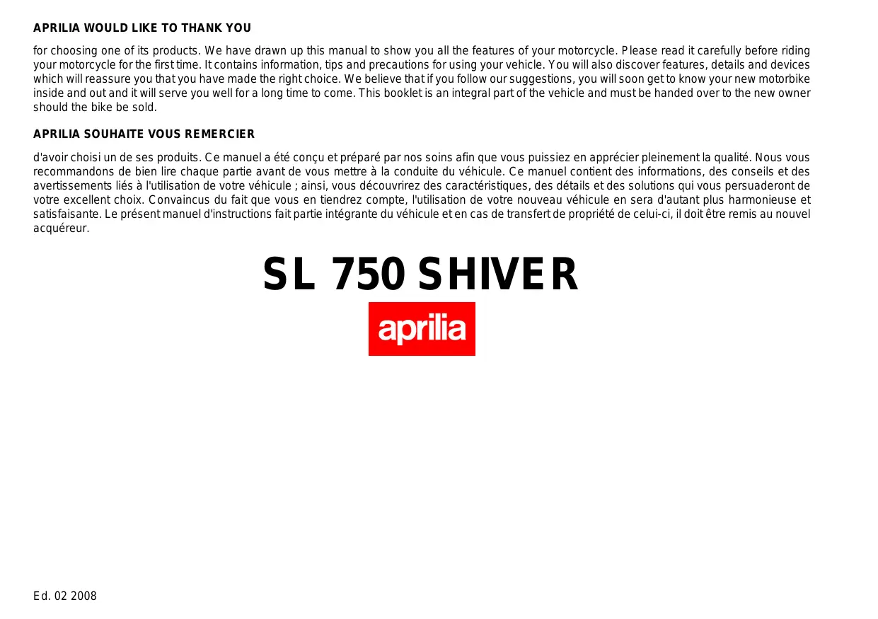 Retrouvez gratuitement la notice de l'appareil SL 750 SHIVER APRILIA au format PDF.