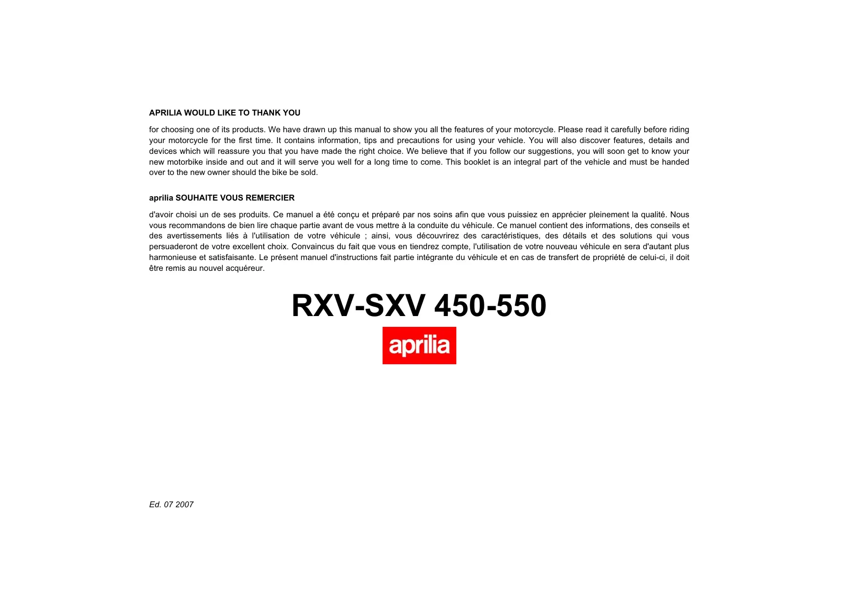 MODE D'EMPLOI SXV450 APRILIA