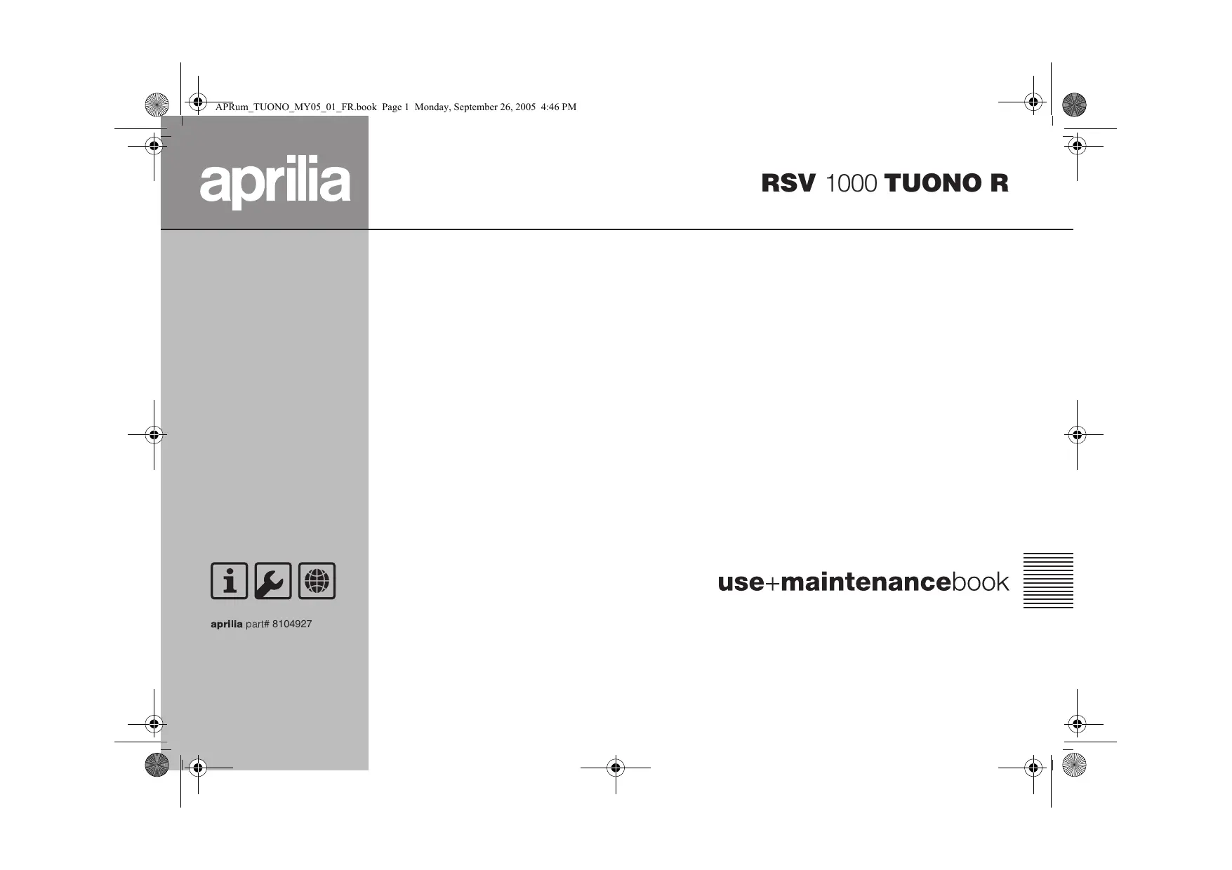 APRum_TUONO_MY05_01_FR.book Page 3 Monday, September 26, 2005 4:46 PM IMPORTANT Ce manuel doit être considéré comme une partie intégrante de ce véhicule et doit toujours lui rester en dotation même en cas de revente. aprilia a conçu ce manuel en prêtant une attention maximum à l’exactitude et l’actualité des informations fournies.