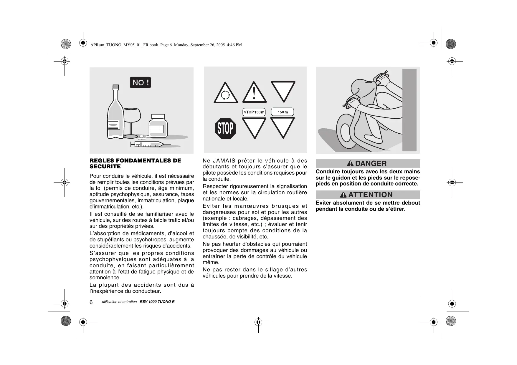APRum_TUONO_MY05_01_FR.book Page 8 Monday, September 26, 2005 4:46 PM VETEMENTS Avant de se mettre en route, se rappeler de porter et d’attacher correctement le casque. S’assurer qu’il est homologué, intact, de la bonne taille et que sa visière est propre. Porter des vêtements de protection, si possible de couleur claire et/ou réfléchissants. De cette manière, le pilote qui sera bien visible vis-à-vis des autres conducteurs réduira considérablement le risque d’être victime d’une collision et il sera mieux protégé en cas de chute. Les vêtements doivent être bien ajustés et fermés aux extrémités ; les cordons, les ceintures et les cravates ne doivent pas pendre ; éviter que ces objets ou autres puissent empêcher la conduite en s’accrochant sur les parties en mouvement ou sur les organes de conduite.