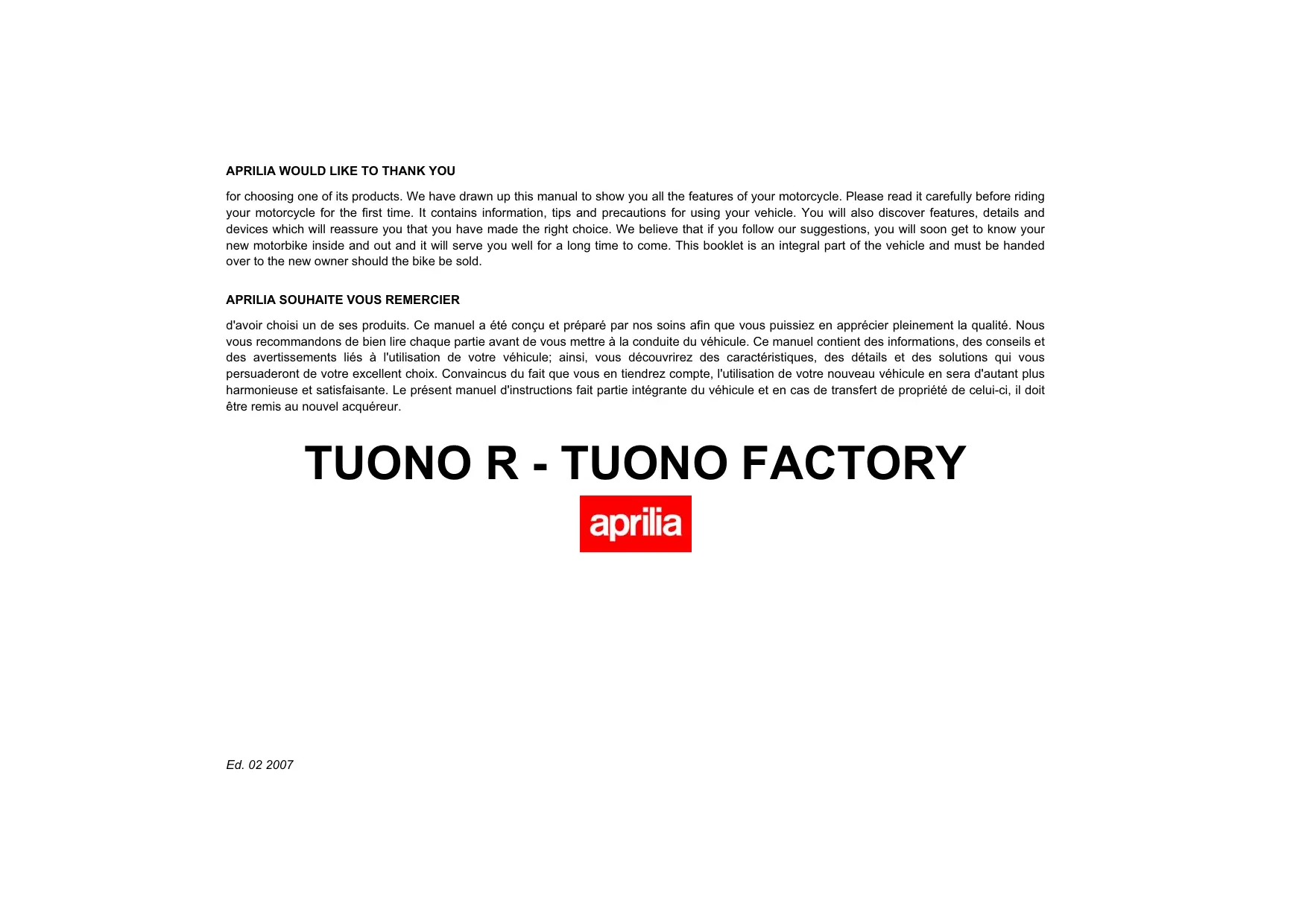 TUONO R - Moto sportive APRILIA - Notice d'utilisation et mode d'emploi gratuit