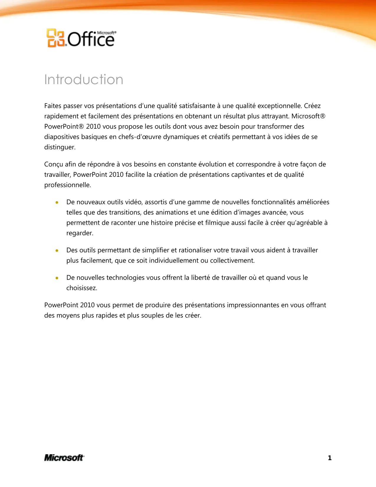- Conditions requises\Divulgation d’informations Introduction Faites passer vos présentations d’une qualité satisfaisante à une qualité exceptionnelle. Créez rapidement et facilement des présentations en obtenant un résultat plus attrayant. Microsoft® PowerPoint® 2010 vous propose les outils dont vous avez besoin pour transformer des diapositives basiques en chefs-d’œuvre dynamiques et créatifs permettant à vos idées de se distinguer. Conçu afin de répondre à vos besoins en constante évolution et correspondre à votre façon de travailler, PowerPoint 2010 facilite la création de présentations captivantes et de qualité professionnelle. p. 87