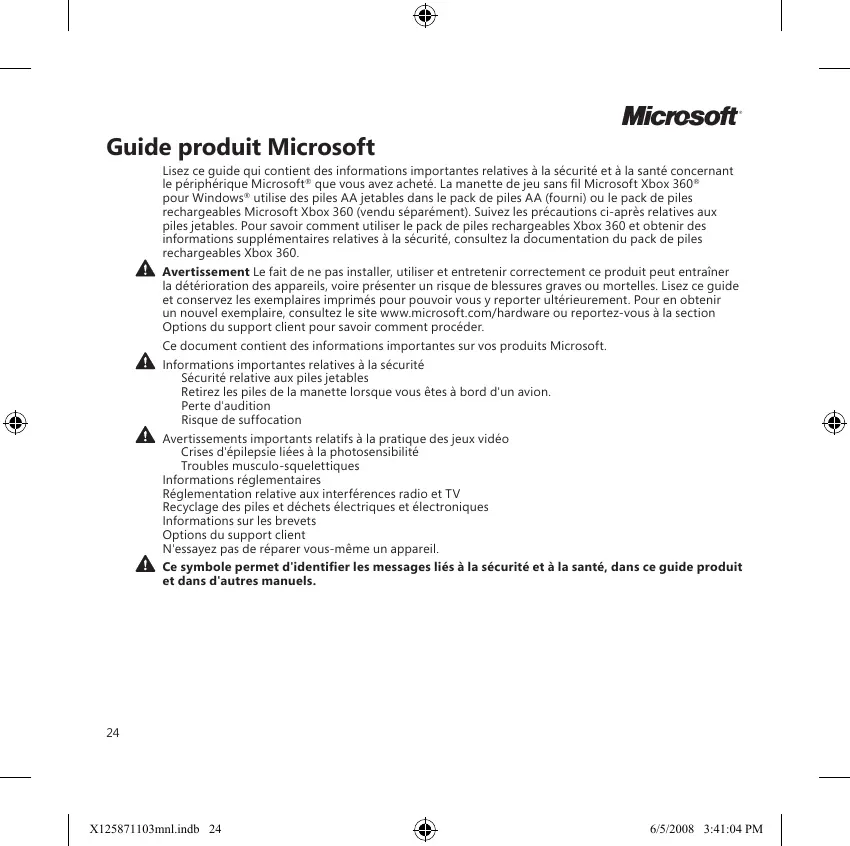 Microsoft Guide produit Microsoft Lisez ce guide qui contient des informations importantes relatives à la sécurité et à la santé concernant le périphérique Microsoft” que vous avez acheté. La manette de jeu sans fl Microsoft Xbox 360° pour Windows® utilise des piles AA jetables dans le pack de piles AA (fourni) ou le pack de piles rechargeables Microsoft Xbox 360 (vendu séparément). Suivez les précautions ci-après relatives aux piles jetables. Pour savoir comment utiliser le pack de piles rechargeables Xbox 360 et obtenir des Informations supplémentaires relatives à la sécurité, consultez la documentation du pack de piles rechargeables Xbox 360 Avertissement Le fait de ne pas installer, utiliser et entretenir correctement ce produit peut entrainer la détérioration des appareils, voire présenter un risque de blessures graves ou mortelles. Lisez ce guide et conservez les exemplaires imprimés pour pouvoir vous ÿ reporter ultérieurement. Pour en obtenir un nouvel exemplaire, consultez le site www microsof.com/hardare ou reportez-vous à la section Options du support client pour savoir comment procéder. Ce document contient des informations importantes sur vos produits Microsoft. À informations importantes relatives à la sécurité Sécurité relative aux ples jetables Retirez les piles de la manette lorsque vous êtes à bord d'un avion Parte d'aucition Risque de suffocation À avertissements importants relatifs à la pratique des jeux vidéo ‘Crises d'éplepse liées à la photosensiblité Troubles musculo-squelettiques informations réglementaires Réglementation relative aux interférences radio et TV Recyclage des piles et déchets électriques et électroniques informations sur les brevets Options du support client N'essayez pas de réparer vous-même un appareil À Ce symbole permet d'identifier les messages liés à la et dans d'autres manuels. urité et à la santé, dans ce guide produit