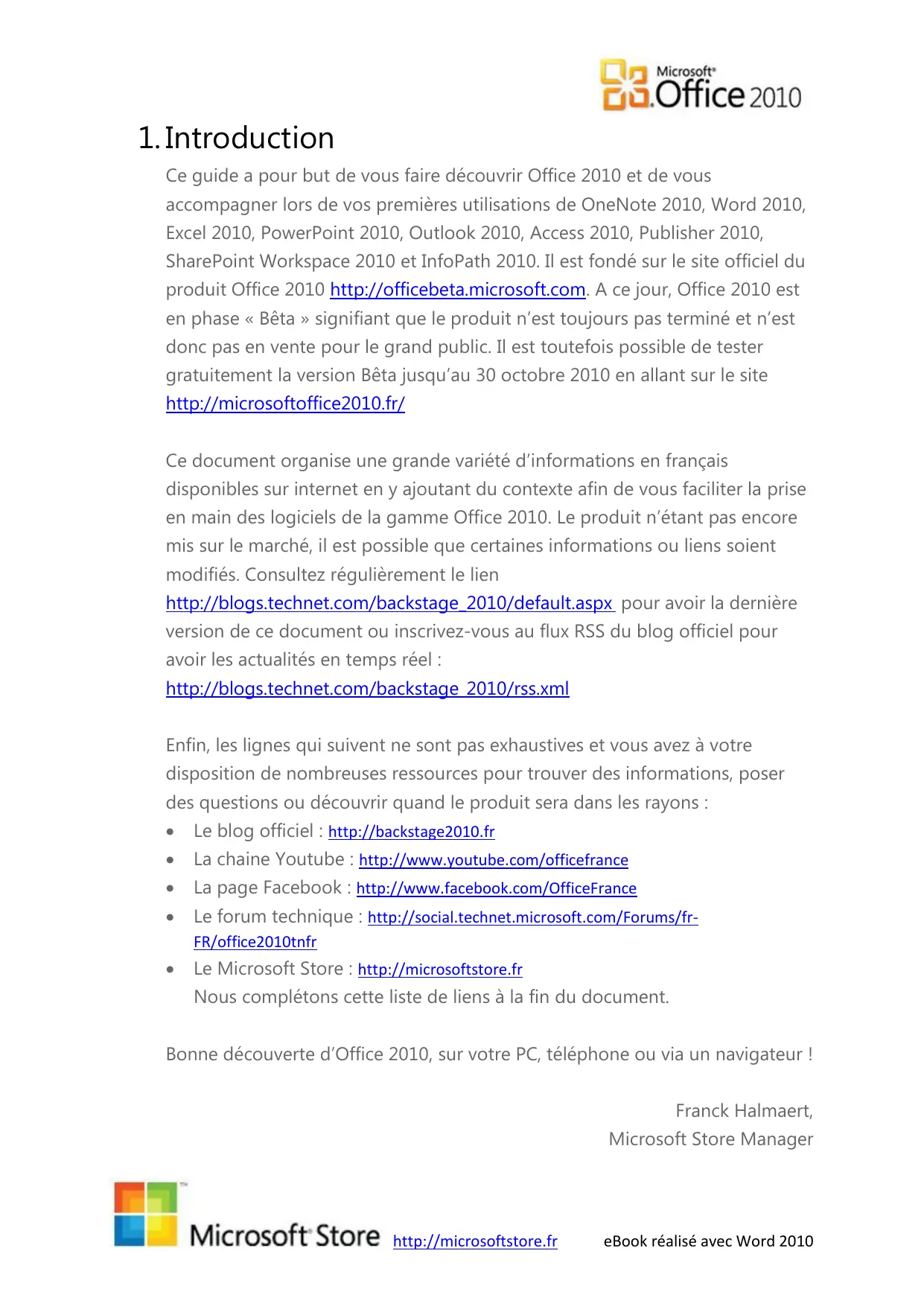Le Microsoft Store : http://microsoftstore.fr Nous complétons cette liste de liens à la fin du document. Bonne découverte d’Office 2010, sur votre PC, téléphone ou via un navigateur ! Franck Halmaert, Microsoft Store Manager http://microsoftstore.fr eBook réalisé avec Word 2010