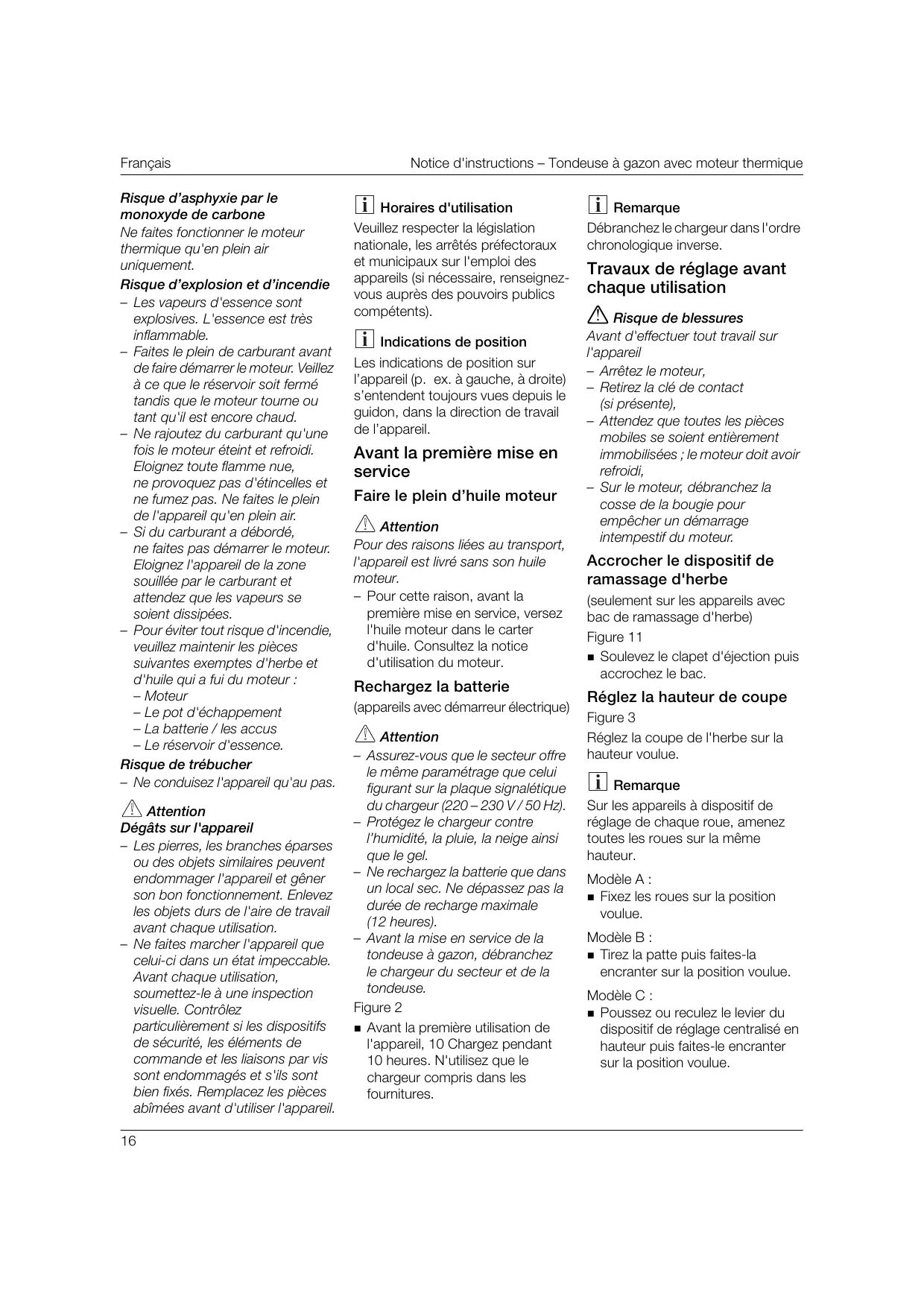- Notice d'instructions – Tondeuse à gazon avec moteur thermique Sommaire Pour votre sécurité p. 13