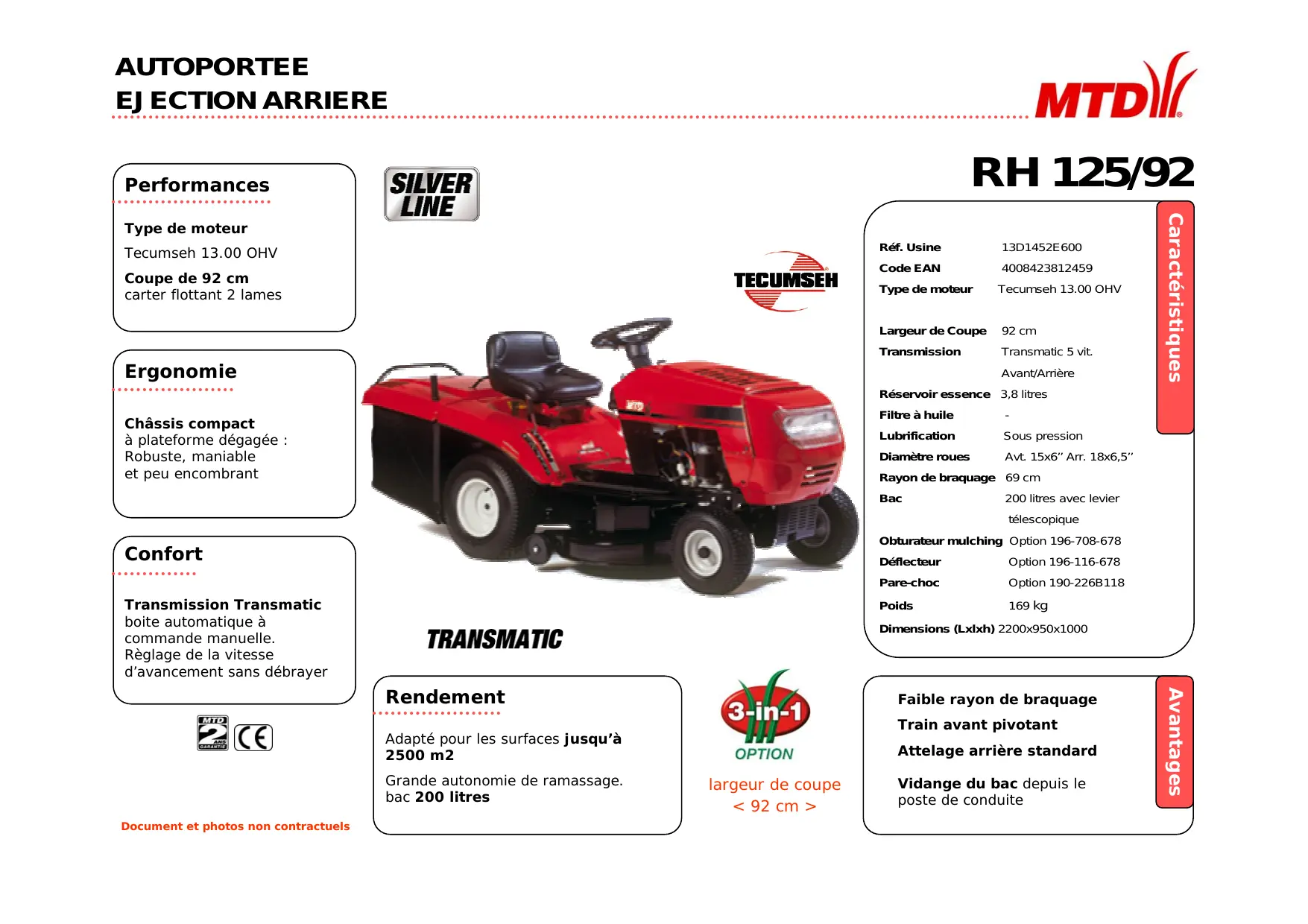 Type de moteur Tecumseh 13.00 OHV Largeur de Coupe 92 cm Transmission Transmatic 5 vit. Ergonomie Avant/Arrière Caractéristiques Type de moteur Réservoir essence 3,8 litres Châssis compact à plateforme dégagée : Robuste, maniable et peu encombrant Filtre à huile