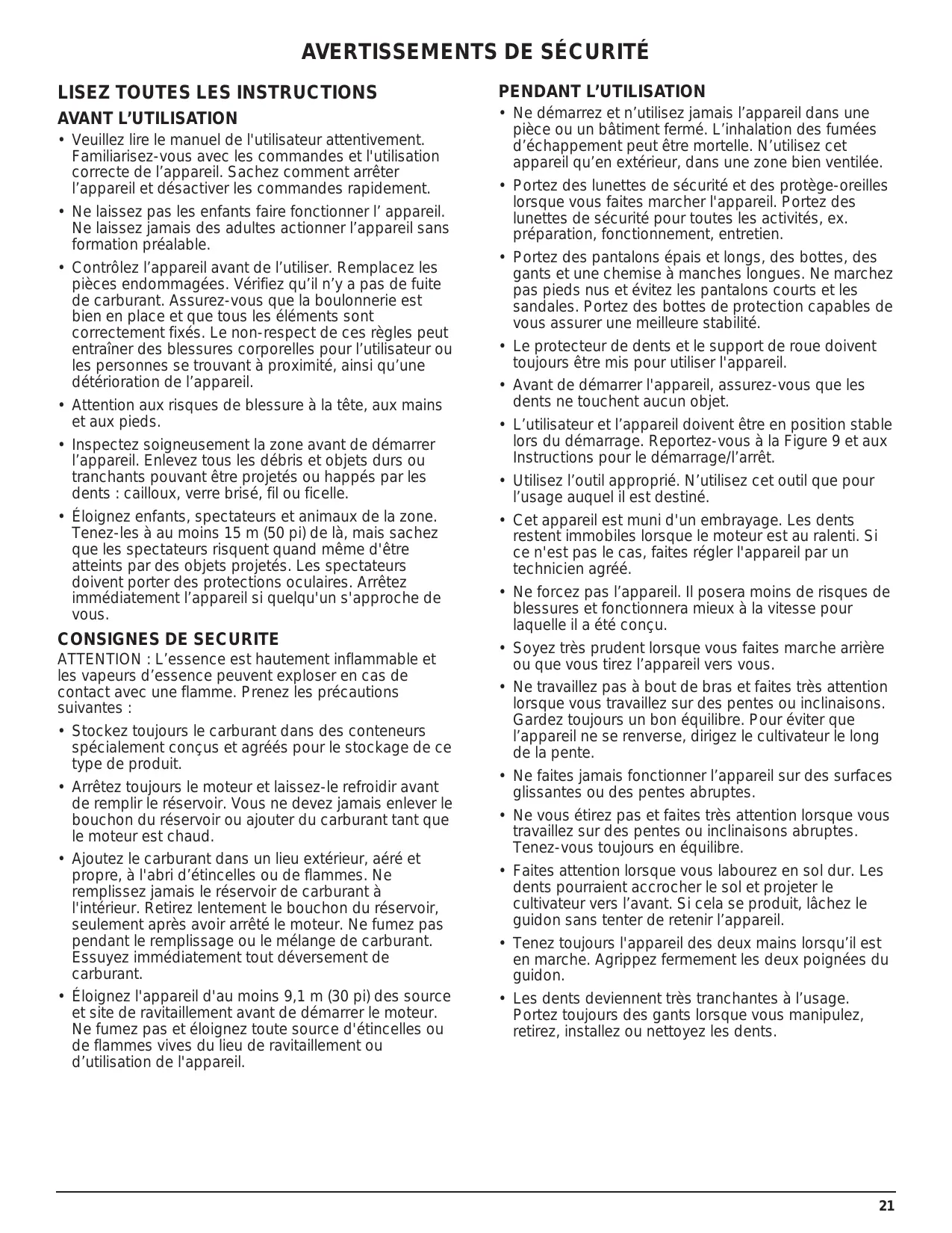 ATTENTION : L’essence est hautement inflammable et les vapeurs d’essence peuvent exploser en cas de contact avec une flamme. Prenez les précautions suivantes :