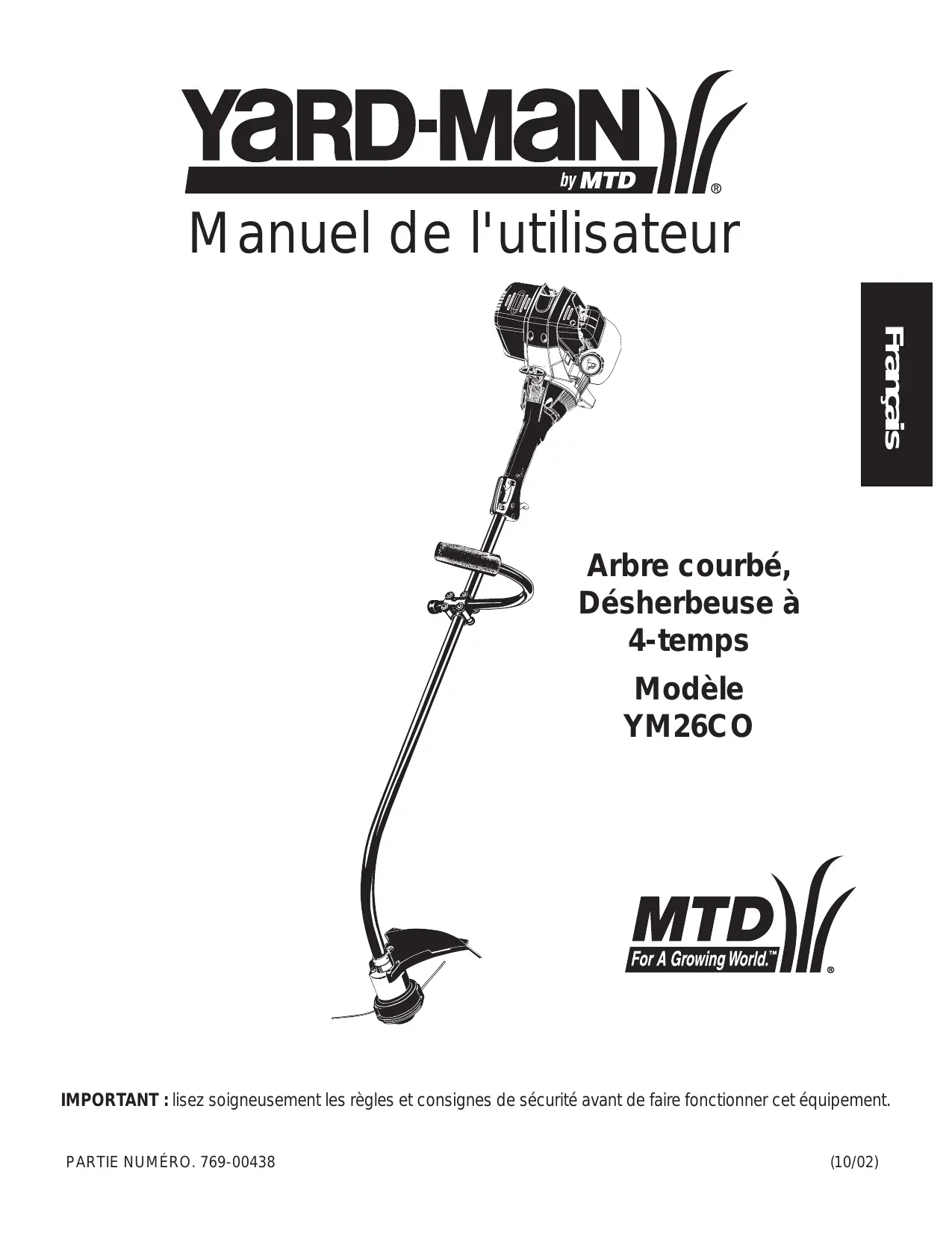 YARD-MAN )/ by MTD M anuel de l'utilisateur Arbre courbé, Désherbeuse à 4-temps Modèle YM26C O0 For À [For À Growing Word."] World." MTD)// IMPORTANT : lisez soigneusement les règles et consignes de sécurité avant de faire fonctionner cet équipement. PARTIE NUMÉRO. 769-00438 (10/02)
