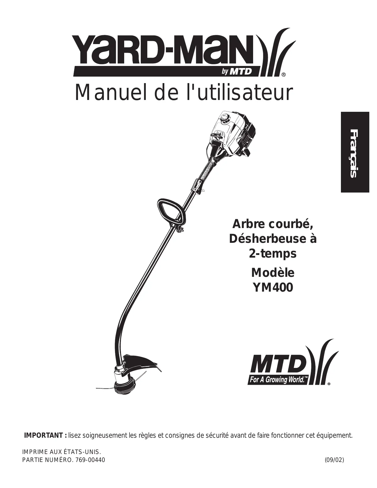 YARD-MAN )/ by MTD M anuel de l'utilisateur Arbre courbé, Désherbeuse à 2-temps Modèle YM400 For À [For À Growing Word."] World." MTD)// IMPORTANT : lisez soigneusement les règles et consignes de sécurité avant de faire fonctionner cet équipement. IMPRIME AUX ÉTATS-UNIS. PARTIE NUMÉRO. 769-00440 (09/02)