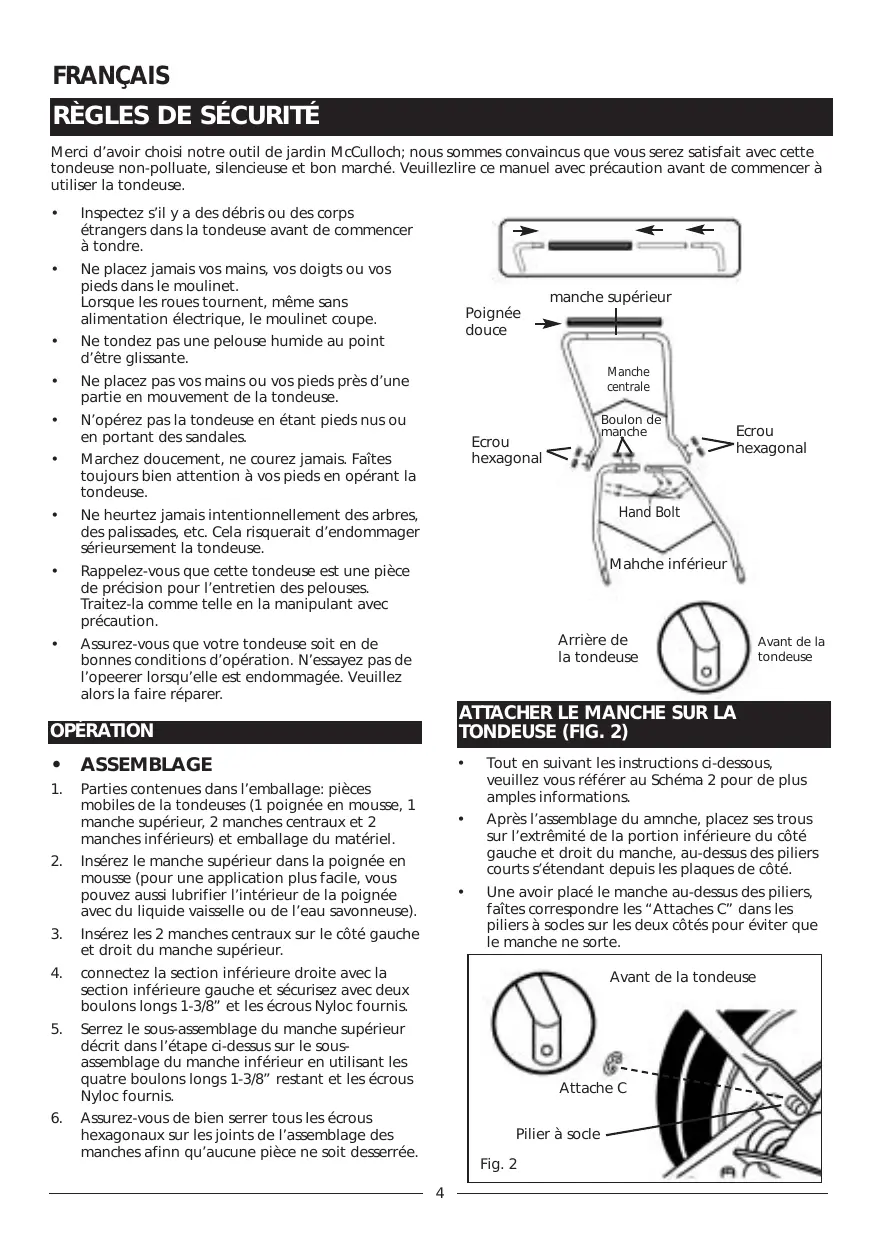 Assurez-vous de bien serrer tous les écrous hexagonaux sur les joints de l’assemblage des manches afinn qu’aucune pièce ne soit desserrée. Avant de la tondeuse Attache C Pilier à socle Fig. 2
