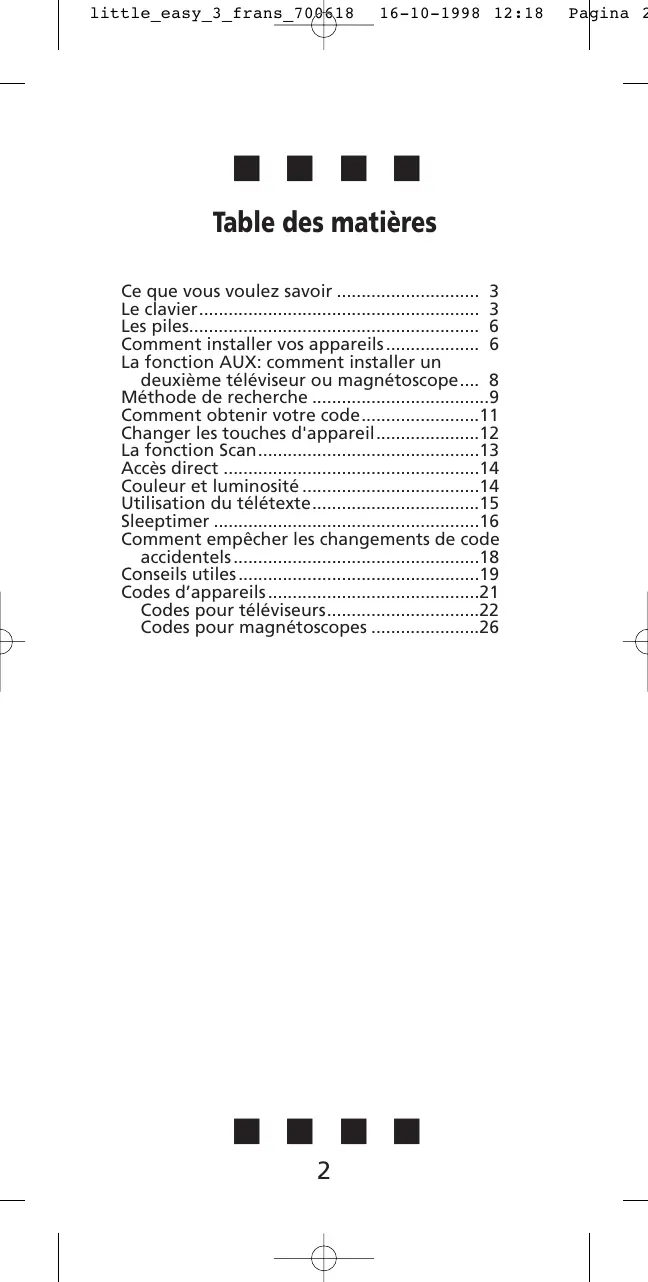 Ce que vous voulez savoir Votre équipement Little Easy comprend: Votre télécommande Little Easy Votre mode d'emploi Little Easy Le mode d'emploi Little Easy comprend deux parties: instructions d'installation et codes des appareils. Vous aurez besoin de votre mode d'emploi pour installer votre nouvelle télécommande Little Easy. Conservez-le donc soigneusement. Votre Little Easy nécessite deux piles alcalines AAA/LR03. Votre Little Easy peut commander trois appareils: un téléviseur, un magnétoscope et un deuxième téléviseur ou magnétoscope. Le clavier Touche Fonction Lampe témoin La diode électroluminescente D.E.L. clignote rouge, pour montrer que la télécommande est en marche. Power (Veille) La touche Veille fonctionne de la même façon que sur votre ancienne télécommande. Touche MAGIC La Touche MAGIC sert à installer votre Little Easy et à accéder à des fonctions spéciales.