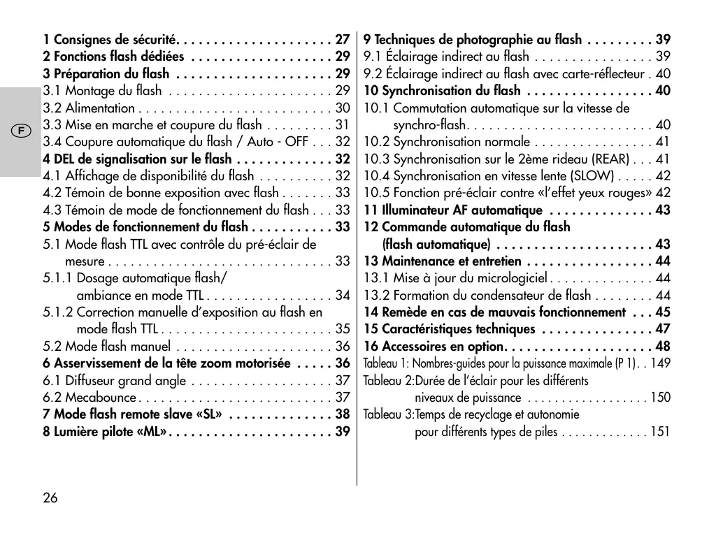 1 Consignes de sécurité. . . . . . . . . . . . . . . . . . . . . 27 2 Fonctions flash dédiées . . . . . . . . . . . . . . . . . . . 29 3 Préparation du flash . . . . . . . . . . . . . . . . . . . . . 29