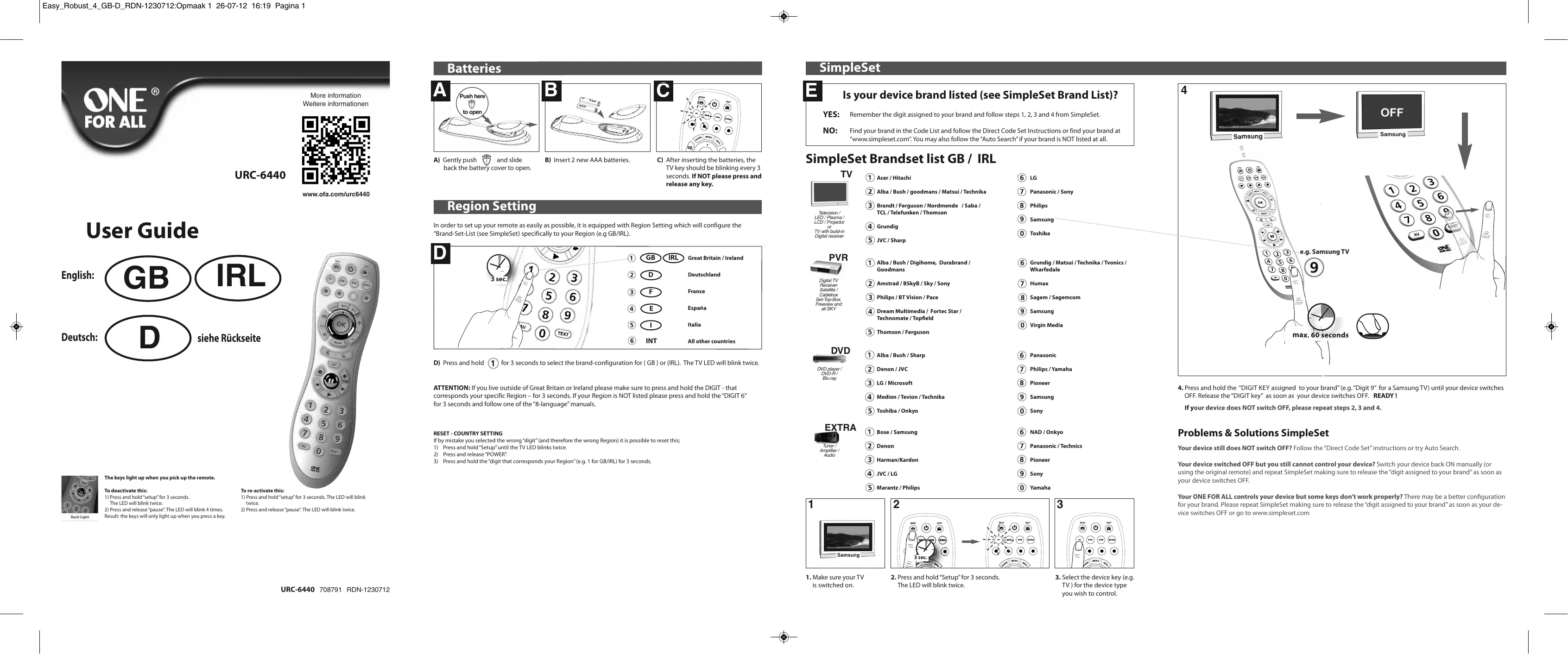 www.simpleset.com Chaque jour, de nouveaux modèles et même de nouvelles marques apparaissent sur le marché. Heureusement, vous avez la possibilité de mettre à jour votre télécommande ONE FOR ALL sur Internet, pour qu'elle ne devienne jamais obsolète. Pour accéder à plus de 6 000 marques et plus de 300 000 modèles, visitez notre outil on line SimpleSet à l'adresse « www.simpleset.com ». Ogni giorno vengono lanciati nuovi modelli e persino nuove marche. Fortunatamente il telecomando ONE FOR ALL può essere aggiornato via Internet, in modo da essere sicuri che non diventi mai obsoleto. Per l'accesso a oltre 6.000 marche e 300.000 modelli, visitare lo strumento on-line SimpleSet all'indirizzo www.simpleset.com.