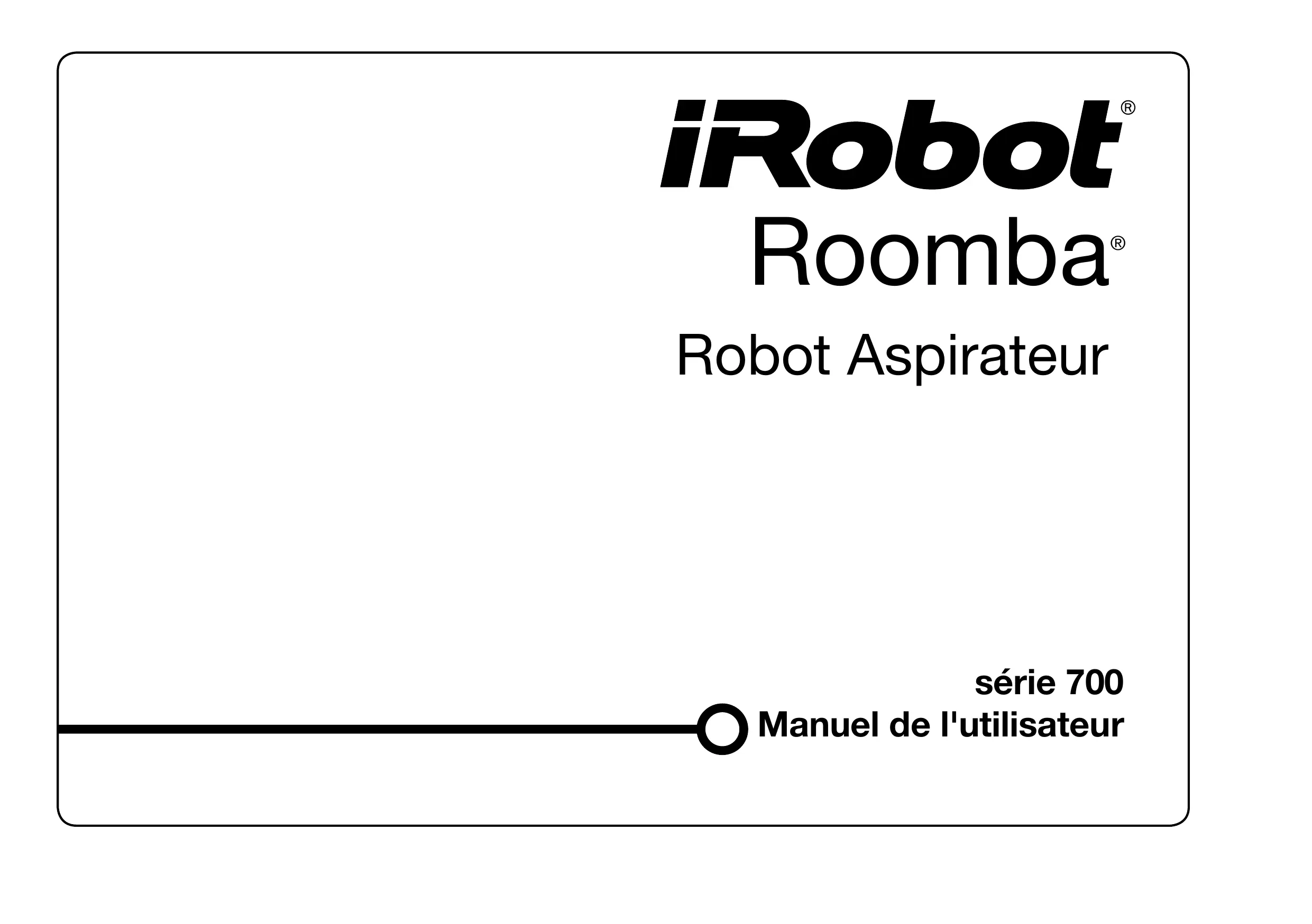 Robot Aspirateur série 700 Manuel de l'utilisateur Cher(e) propriétaire d'un Roomba, Mise en route Merci d'avoir choisi un robot aspirateur iRobot Roomba nouvelle génération. Vous rejoignez une communauté pas comme les autres dont les membres, 5 millions à ce jour, un chiffre qui ne fait qu'augmenter, découvrent à quel point il est utile, pratique et simple de posséder un robot domestique. En fait, les propriétaires tendent à aimer leur Roomba à un point tel qu'ils lui ont même donné un surnom. Avant d'utiliser votre Roomba pour la première fois, retournez-le et retirez la languette de la batterie. Utilisez la Home Base™ pour charger la batterie pendant la nuit. Nous aussi, nous sommes passionnés par nos robots. Notre passion n'a rien de surprenant puisque depuis quelque 20 ans, nous nous consacrons à la fabrication de robots. Préparation de la zone à nettoyer Maintenant, l'envie d'essayer votre Roomba vous démange sûrement, mais il est préférable de commencer par jeter un rapide coup d'œil au présent manuel. Il vous sera ainsi plus facile de l'utiliser et vous gagnerez même du temps. J'espère que votre Roomba vous procurera beaucoup de plaisir, et au nom de toute l'équipe, je vous remercie encore une fois d'avoir choisi iRobot. Cordialement, Préparer Roomba Colin Angle Président, PDG et cofondateur, iRobot Corporation Prendre soin de votre aspirateur iRobot Roomba Petites astuces Pour de meilleurs résultats, utilisez-le souvent ! Après chaque usage, videz le bac et nettoyez le filtre. Les brosses font quasiment tout le travail ; il est donc bon, comme pour une brosse à cheveux, de les démonter environ une fois par semaine et de retirer les poils, les cheveux et la poussière qui se sont amassés autour et sous les roulements (voir les schémas dans la section Entretien indispensable). Pour prolonger la vie de la batterie, il est recommandé de la recharger dès que possible et de brancher votre Roomba avant de le ranger. Pour le rangement à long terme, retirer et placer la batterie dans un endroit frais et sec. *La sécurité d'abord* Étant donné que votre Roomba contient des pièces électroniques, il ne faut pas l'immerger ni l'asperger d'eau : ne le nettoyer qu'avec un chiffon sec. Avant d'utiliser votre produit pour la première fois, lisez les consignes importantes de sécurité qui figurent à la fin du manuel. Mise en en marche | Prendre soin de votre aspirateur Roomba Même si votre Roomba est suffisamment intelligent pour se déplacer de façon autonome, il a toutefois besoin d'un peu d'aide. Les franges des tapis ne posent aucun problème ; par contre, il faut mettre de l'ordre dans la pièce et ramasser les câbles qui traînent. Même si la poussière, la saleté et la crasse sont la cible ultime de l'appareil, évitez tout ce qui est humide.