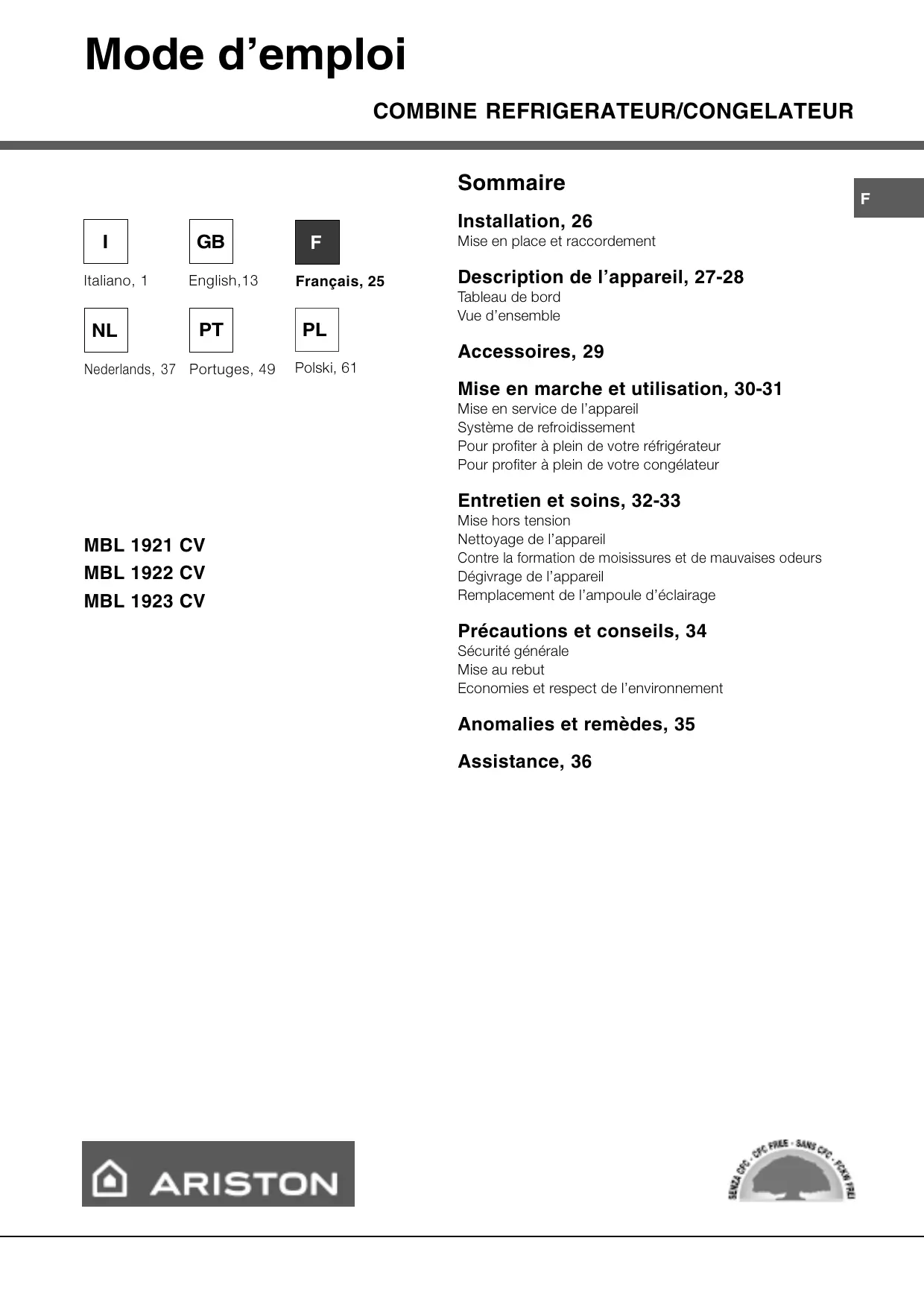 Retrouvez gratuitement la notice de l'appareil MBL 1923 CV HOTPOINT-ARISTON au format PDF.