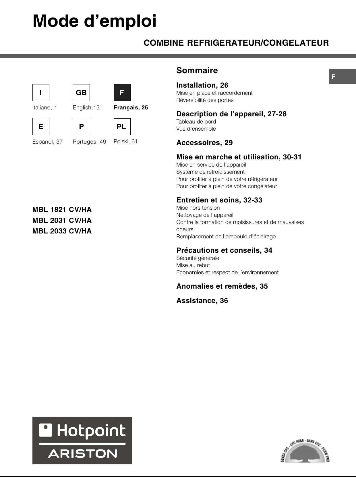 Retrouvez gratuitement la notice de l'appareil MBL 2031 CV HOTPOINT-ARISTON au format PDF.