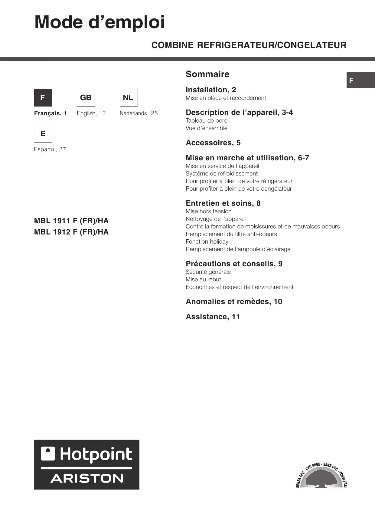 Retrouvez gratuitement la notice de l'appareil MBL 1912 F HOTPOINT-ARISTON au format PDF.