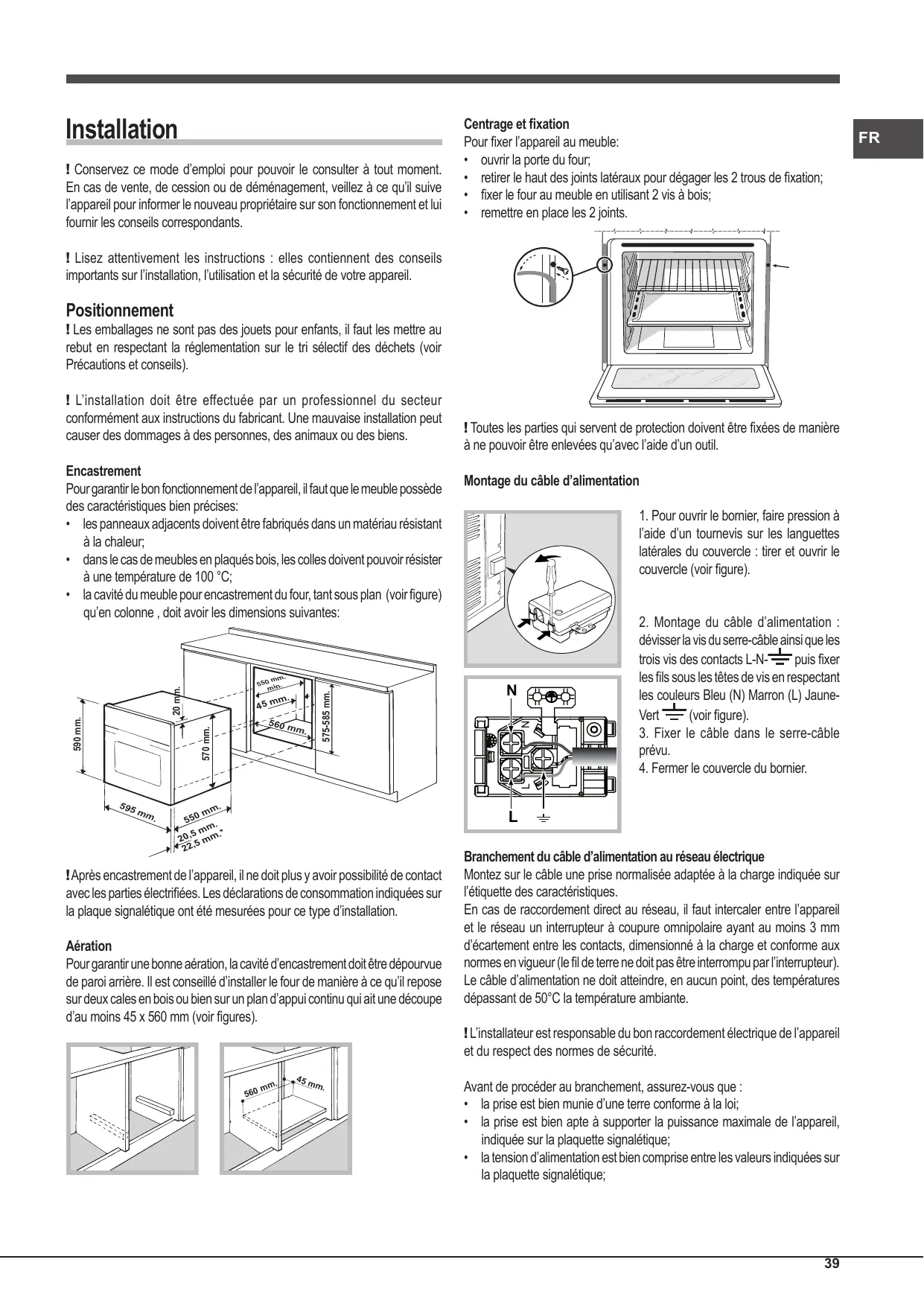 ! Après encastrement de l’appareil, il ne doit plus y avoir possibilité de contact avec les parties électrifiées. Les déclarations de consommation indiquées sur la plaque signalétique ont été mesurées pour ce type d’installation. Aération Pour garantir une bonne aération, la cavité d’encastrement doit être dépourvue de paroi arrière. Il est conseillé d’installer le four de manière à ce qu’il repose sur deux cales en bois ou bien sur un plan d’appui continu qui ait une découpe d’au moins 45 x 560 mm (voir figures).