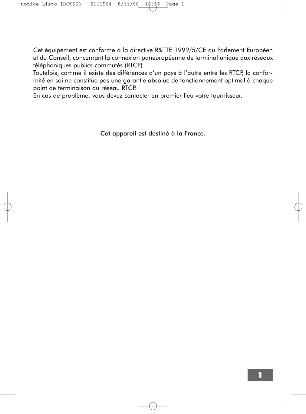 Cet équipement est conforme à la directive R&TTE 1999/5/CE du Parlement Européen et du Conseil, concernant la connexion paneuropéenne de terminal unique aux reseaux téléphoniques publics commutes (RTCP).