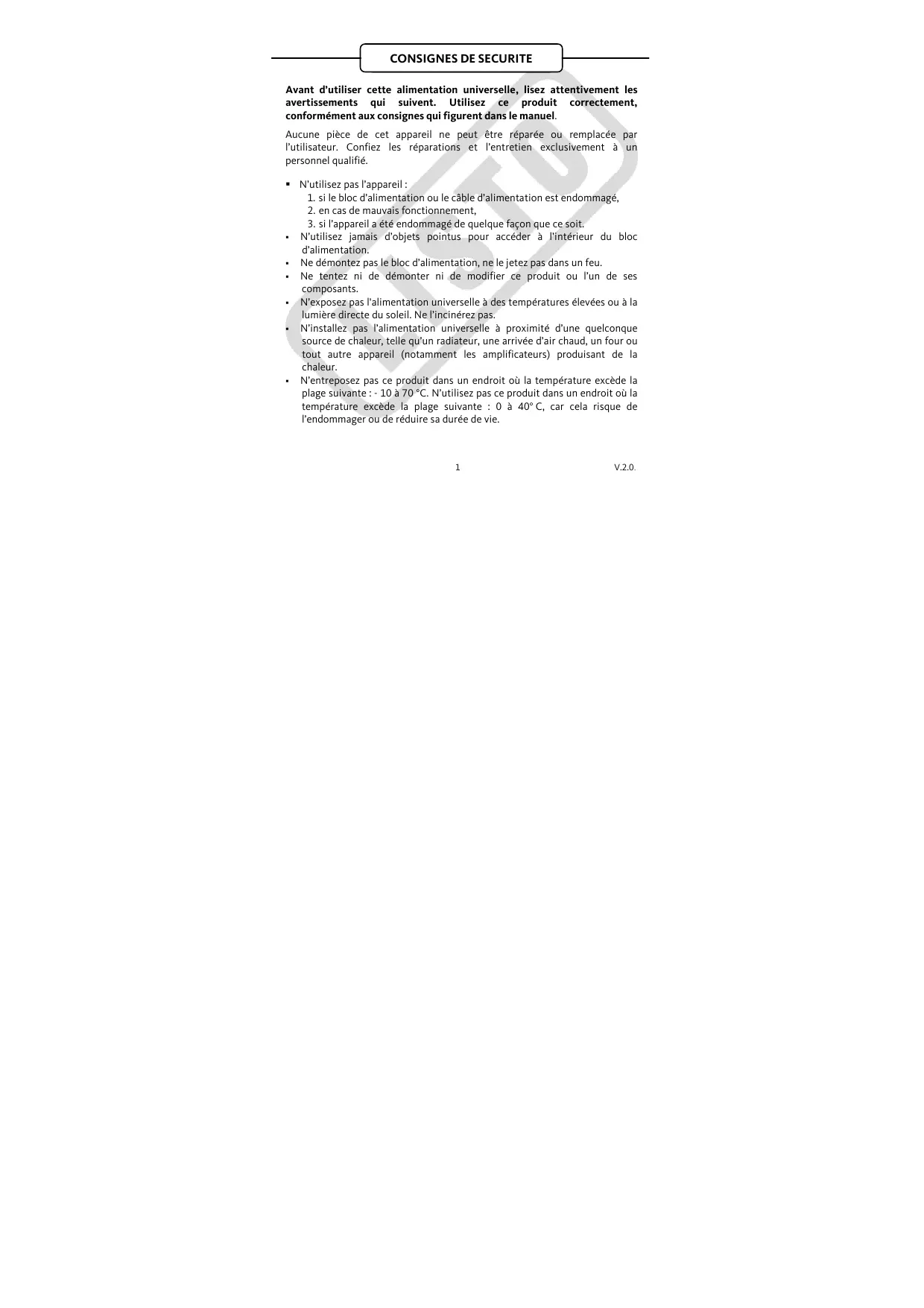 Avant d'utiliser cette alimentation universelle, lisez attentivement les avertissements qui suivent. Utilisez ce produit correctement, conformément aux consignes qui figurent dans le manuel.